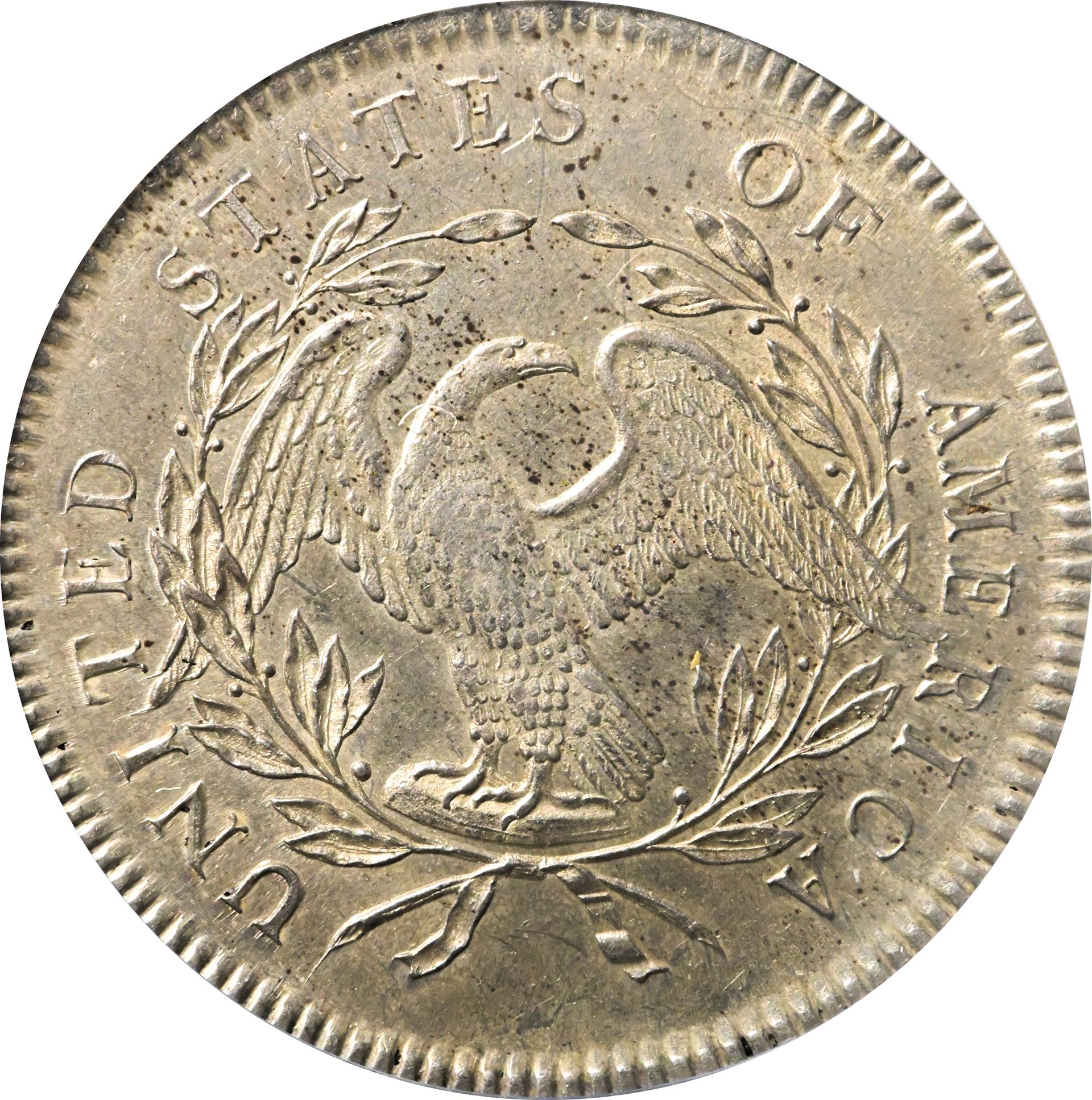 Congress had specified that the new coins should bear a design “emblematic of Liberty,” and Scot accomplished this with a right-facing portrait of a youthful female figure whose hair flowed freely behind her—hence the descriptive term “Flowing Hair.” The word LIBERTY appears above her, with the date below and 15 stars along the sides, symbolizing the number of states in the Union at that time. Scot is said to have meant the flowing hair to signify freedom. A pattern 25-cent piece of 1792 served as Scot’s model for the obverse; this had been designed by Joseph Wright, who died of yellow fever in 1793 after serving briefly as Mint engraver. The dollar’s reverse depicts a small, spread-winged eagle perched upon a rock and surrounded by laurel branches. Encircling this, along the border, is the motto UNITED STATES OF AMERICA. The dollar’s “third side,” the edge, carries the inscription HUNDRED CENTS ONE DOLLAR OR UNIT, with decorations separating the words.