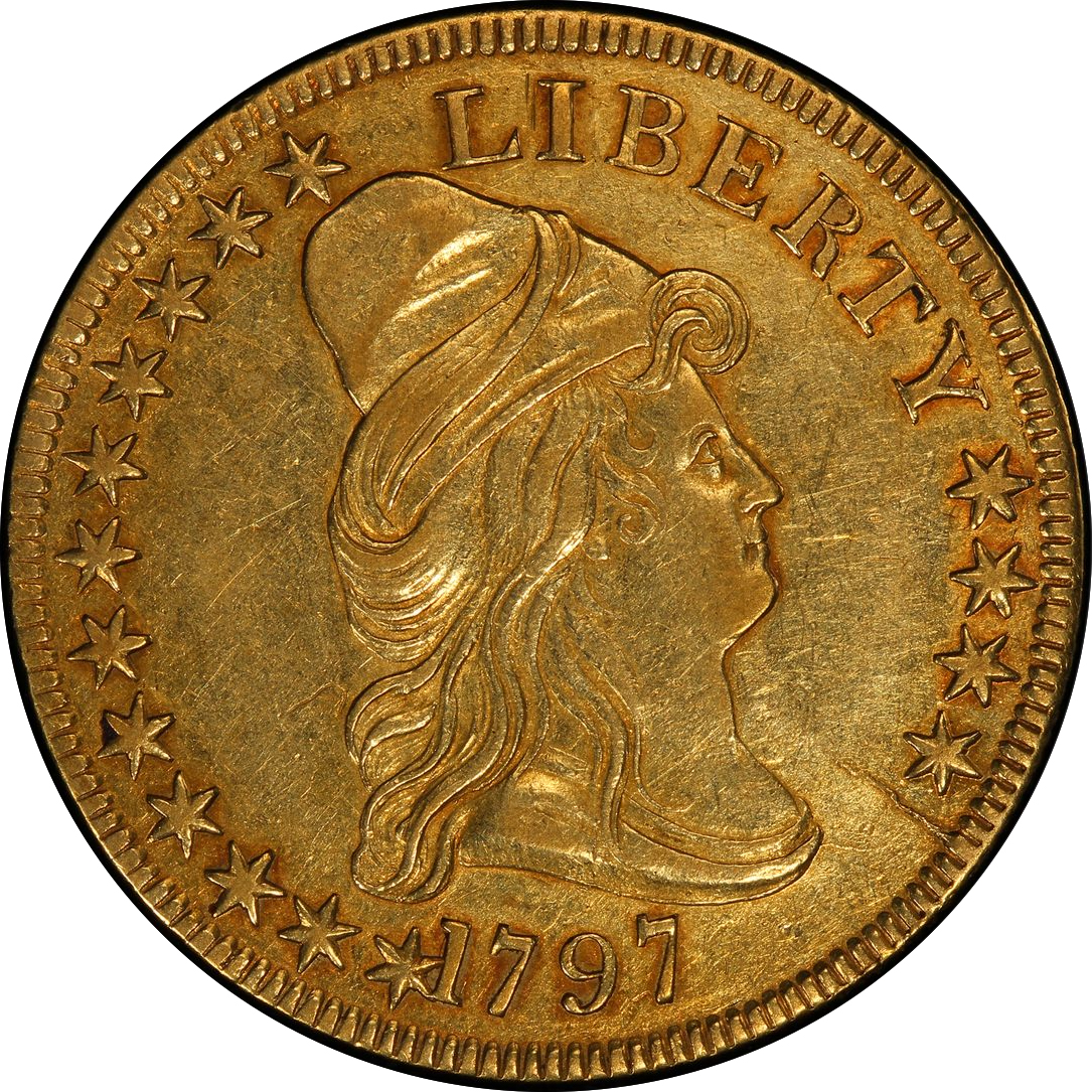 Because early U.S. gold saw little circulation, most surviving Capped Bust/Small Eagle tens are found in relatively high grades, generally from Very Fine to Almost Uncirculated. Mint state specimens are occasionally available, usually the 1795 issues, which appear much more frequently than the later dates of this design. The 1795 coins are often encountered with prooflike surfaces, including some amazingly well-preserved “gems”—apparently many were saved as first-year-of-issue souvenirs. Perhaps some of these exceptional specimens are from the group of 100 eagles presented by Mint Director Henry DeSaussere to President George Washington in October of 1795.