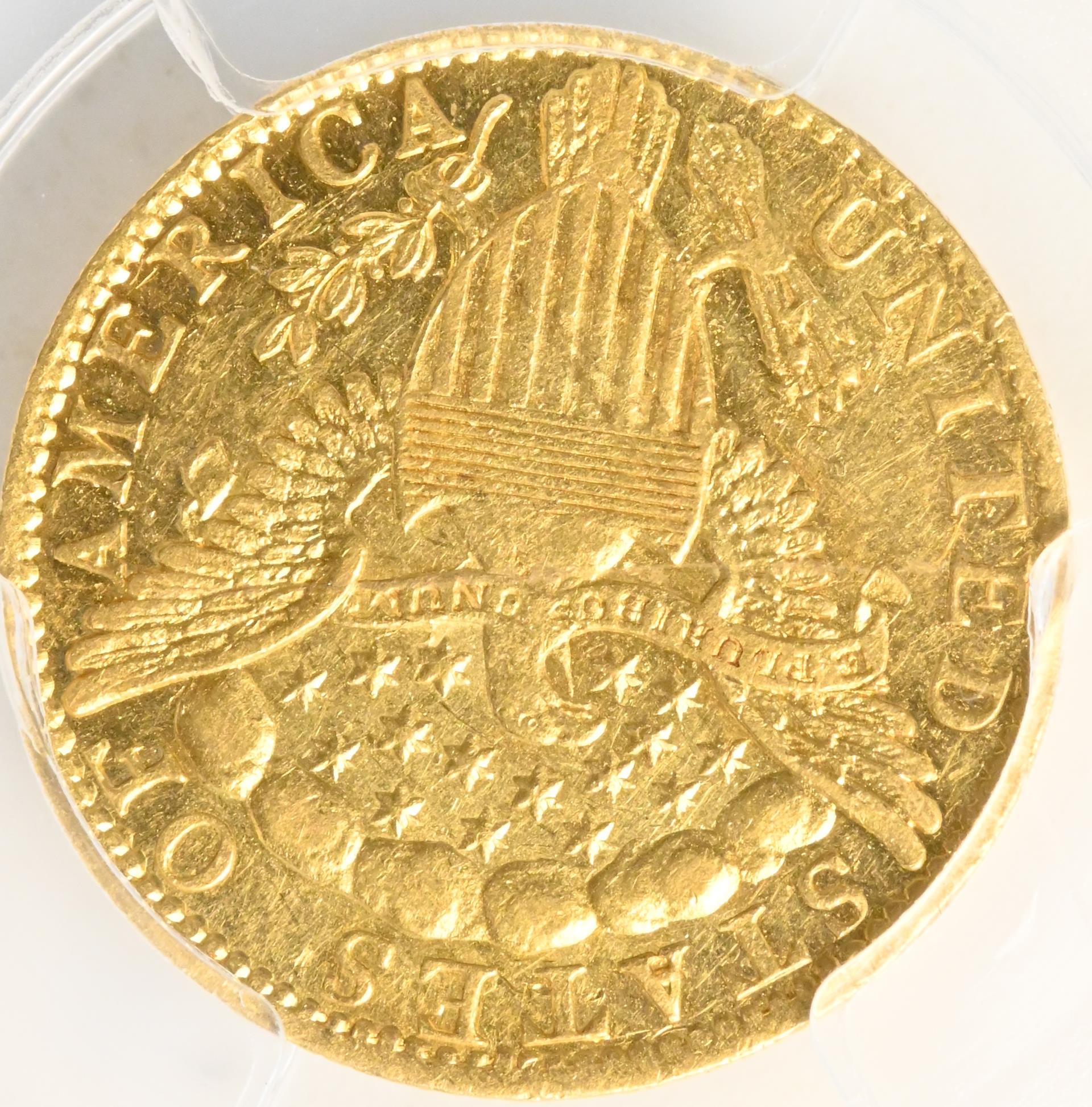 These first quarter eagles lacked stars on the obverse because they were placed on the reverse as part of the new Heraldic eagle design. However, the half eagle and eagle were still using the small eagle reverse, with stars on their respective obverses. Whether due to artistic taste or uniformity of design, the quarter eagle obverse received stars for the last coinage of 1796. With Tennessee’s recent admission to the Union, 16 stars were on the obverse: eight left, eight right. After Tennessee was admitted however, Mint Director Boudinot realized the impracticality of adding a star for each new state. Thereafter, only 13 stars were to be used, symbolizing the original states. The No Stars variety of this year stands alone as a distinct separate type, but date collectors generally include it as a part of the extended series.