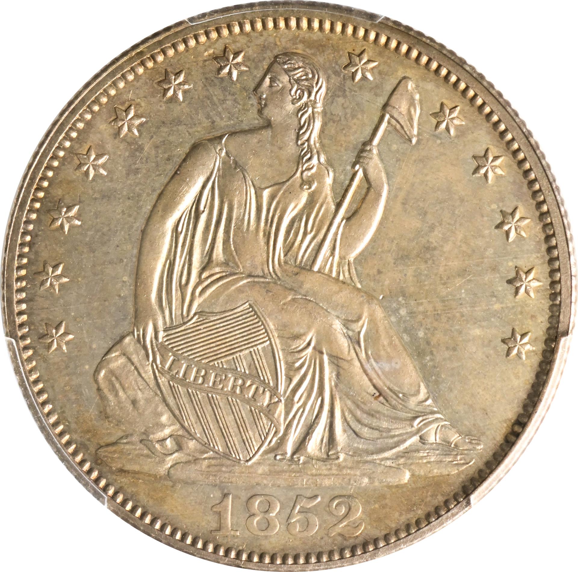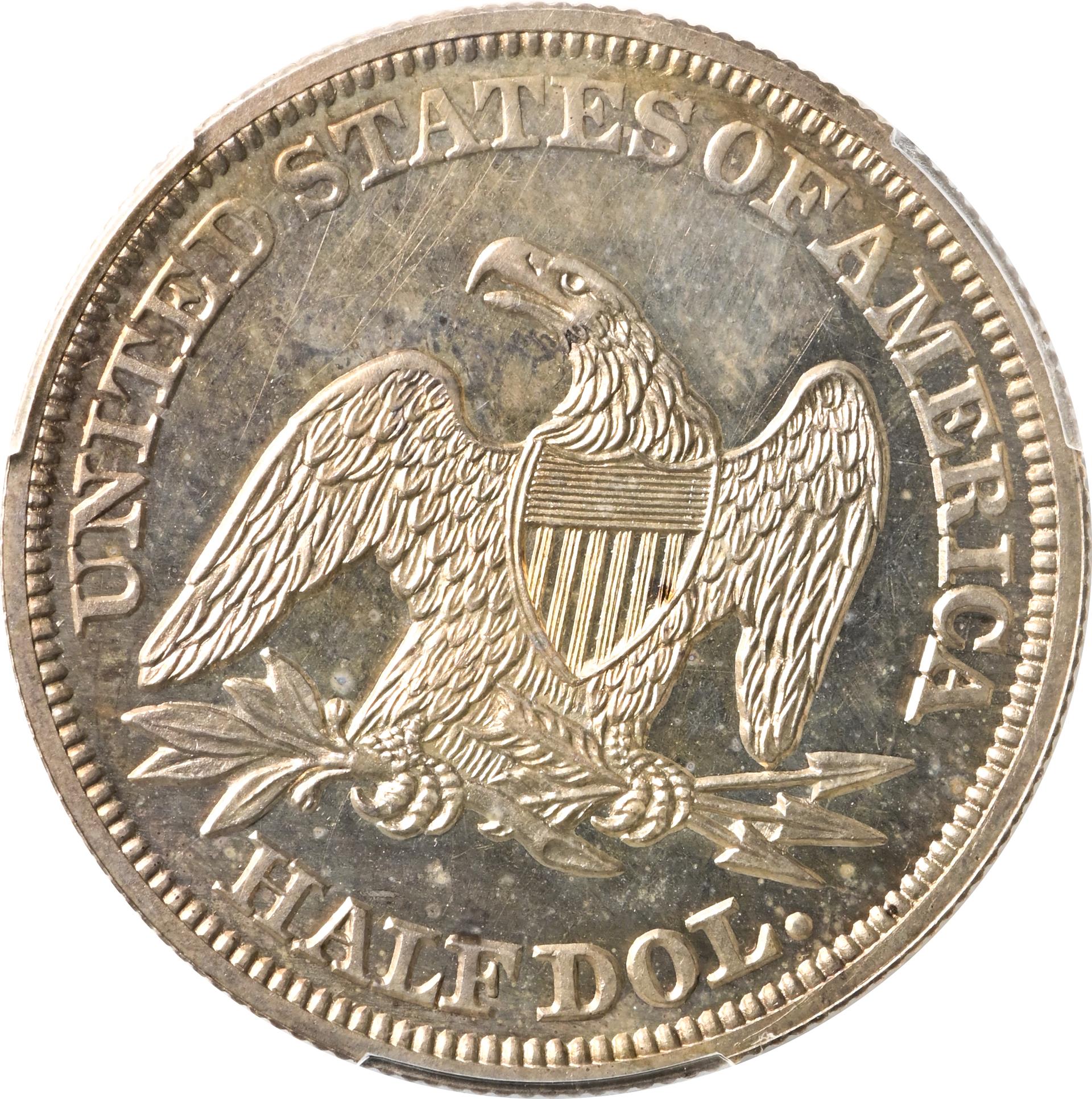 Although high-end, mint state Arrows coins exist in large enough quantities to satisfy collector demand, the same cannot be said for proofs. Unfortunately, 19th century collectors did not regard these coins with the same respect shown by their successors, and handling marks and hairlines are the rule rather than the exception for proofs of this type. When grading this design, or any Seated Liberty half, wear will first show on Liberty’s head, breast and knees. On the reverse, check the eagle’s head, neck and wing-tops.