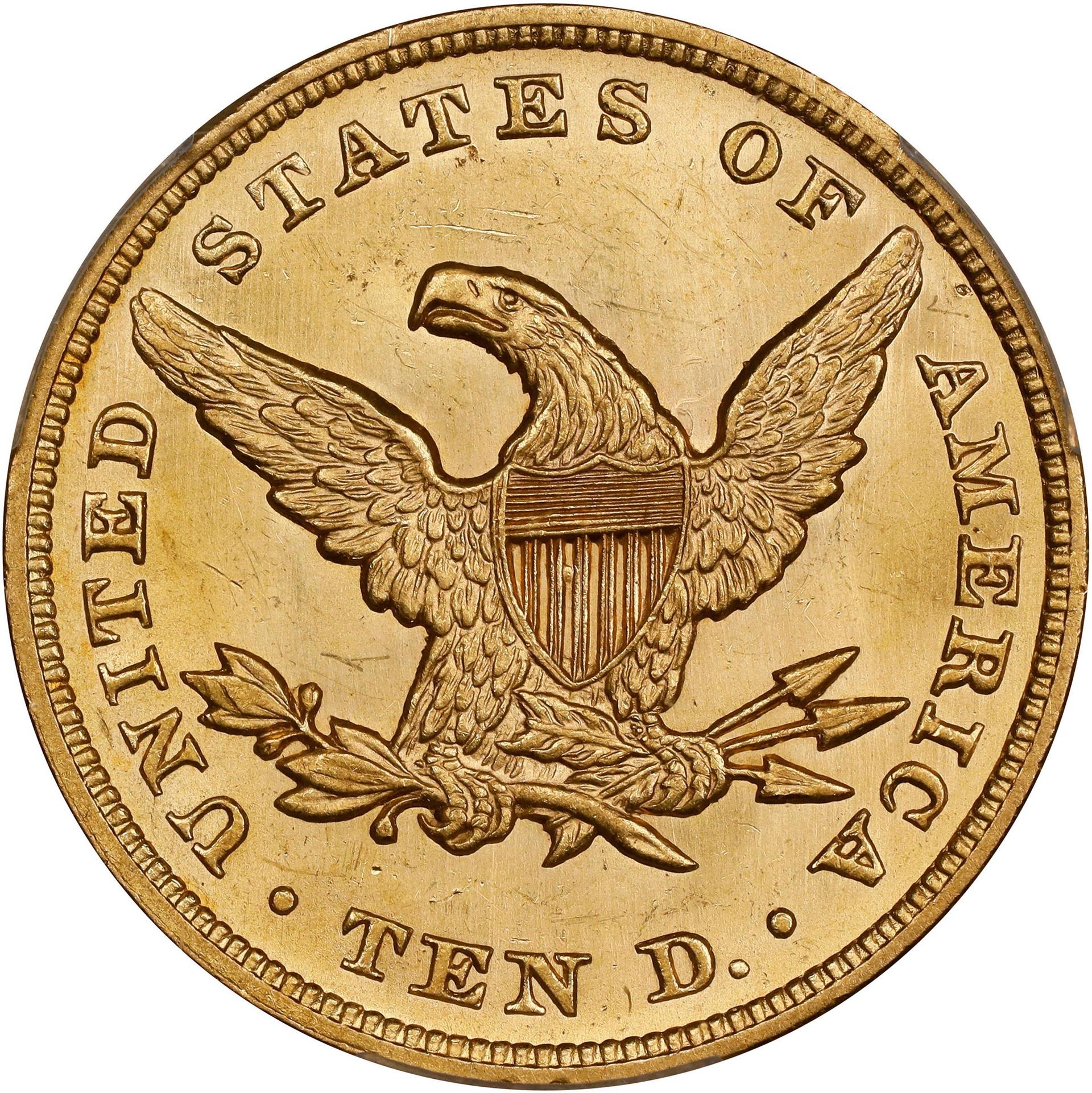 Gobrecht’s design, inspired by the portrait of Venus in Benjamin West’s Painting Omnia Vincit Amor (Love Conquers All), also became the prototype for the half-eagle and large cent of 1839. It features a bust of Liberty facing left, wearing a coronet inscribed LIBERTY. Her hair is knotted in the back with hang- ing curls. Thirteen stars encircle the bust, with the date positioned below. The reverse depicts an eagle holding an olive branch and arrows, surrounded by the inscriptions UNITED STATES OF AMERICA and TEN D. Mintmarks are below the eagle.