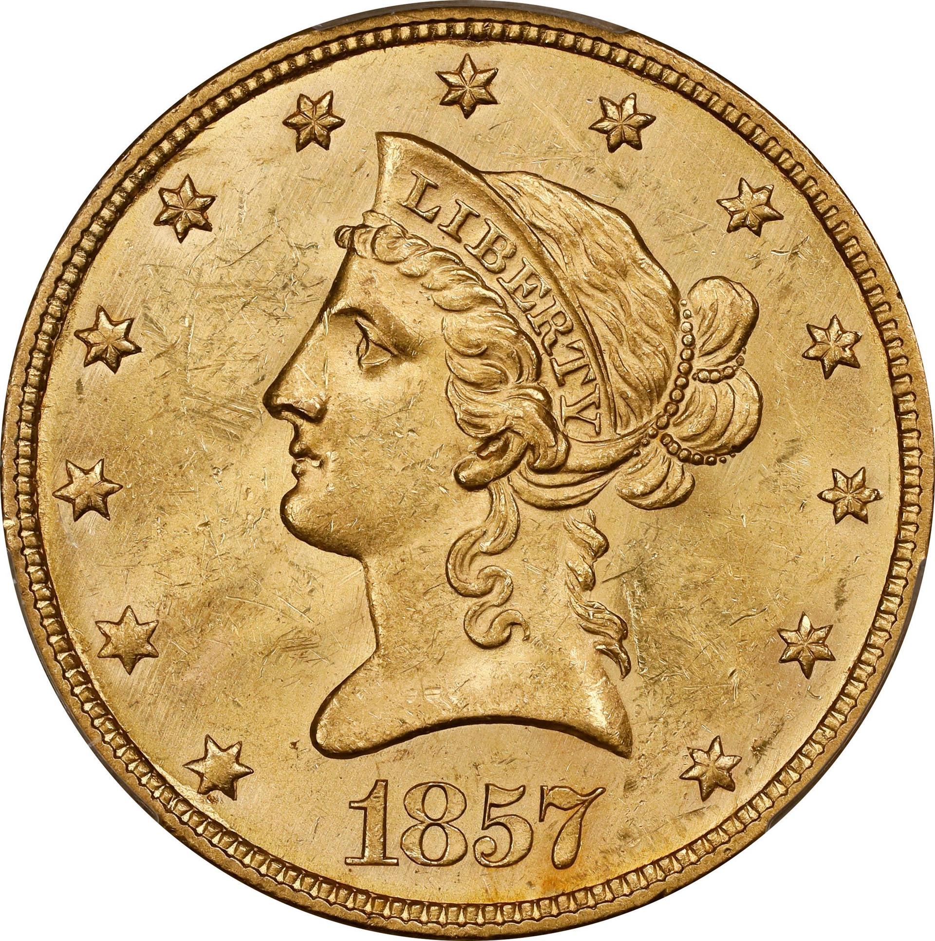 No Motto eagles are not difficult to grade. Look for traces of wear on the top of the coronet over Liberty’s forehead, on the top of her hair and just over her eye. On the reverse, check the tips of the eagle’s wings, neck and claws. Unfortunately, well made twentieth century counterfeits exist. Originally made in the Middle East as a way of producing bullion in a recognizable form, many have found their way into the numismatic market. The very rare 1858 Philadelphia issue has also been counterfeited, usually by removing the mintmarks from San Francisco or New Orleans coins of that year. Authentication of any questionable piece is highly recommended.