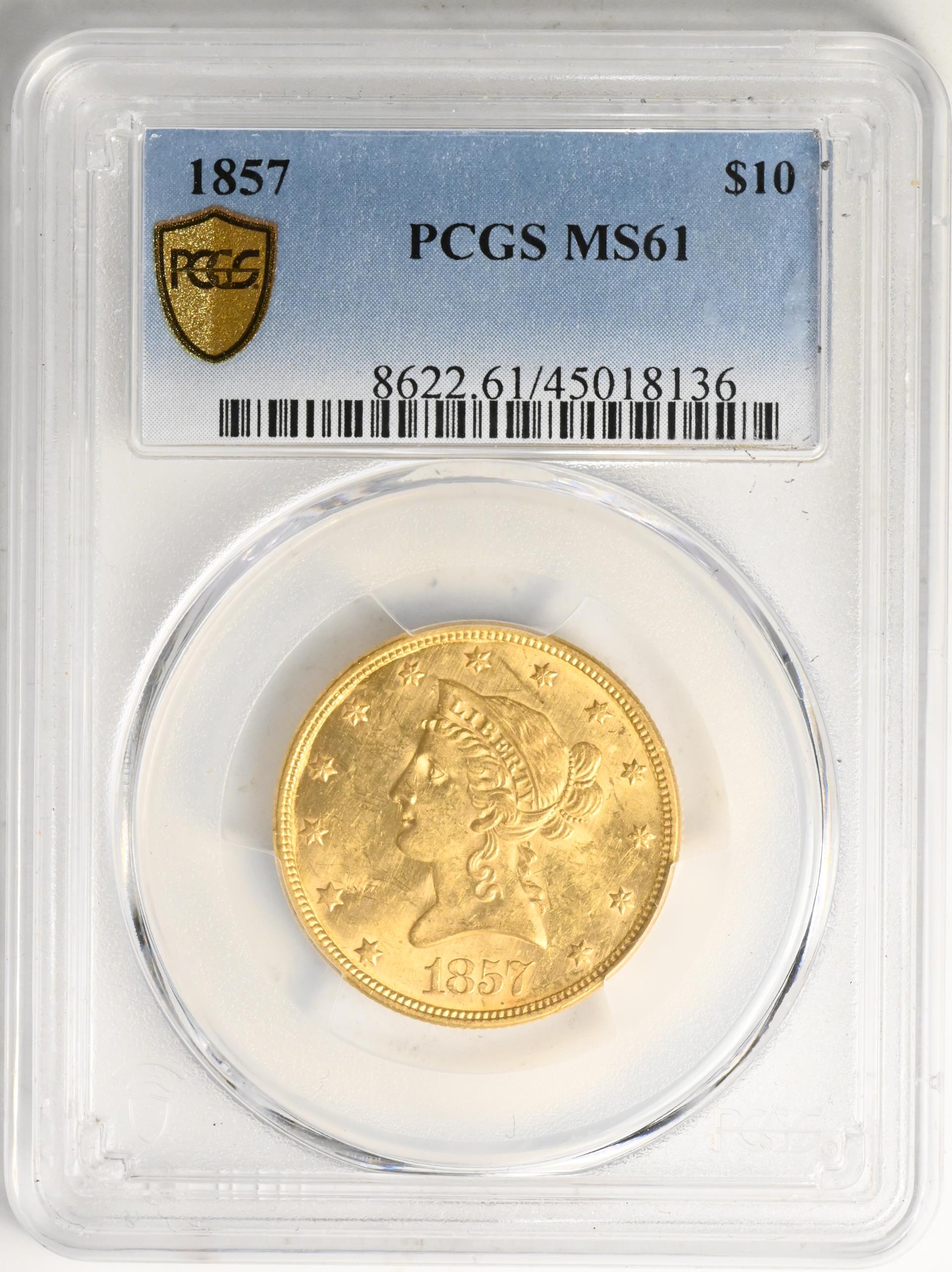 Struck in Philadelphia (no mintmark) every year of the series, No Motto eagles were also minted in New Orleans (O) from 1841 through 1860, and in San Francisco (S) from 1854 through 1866. About 5.3 million business strikes and 400 proofs were made, but unfortunately, few were preserved. Mintages were small and most survivors didn’t make it past the recall and meltings of the 1930s. As a result, it is difficult to find high grade specimens of any date in the series. There are no “common-dates” in uncirculated condition—every issue is rare, and only a handful even approach the grade of MS-65. Superb pieces occasionally appear, but almost exclusively in sales of the largest and most famous collections.