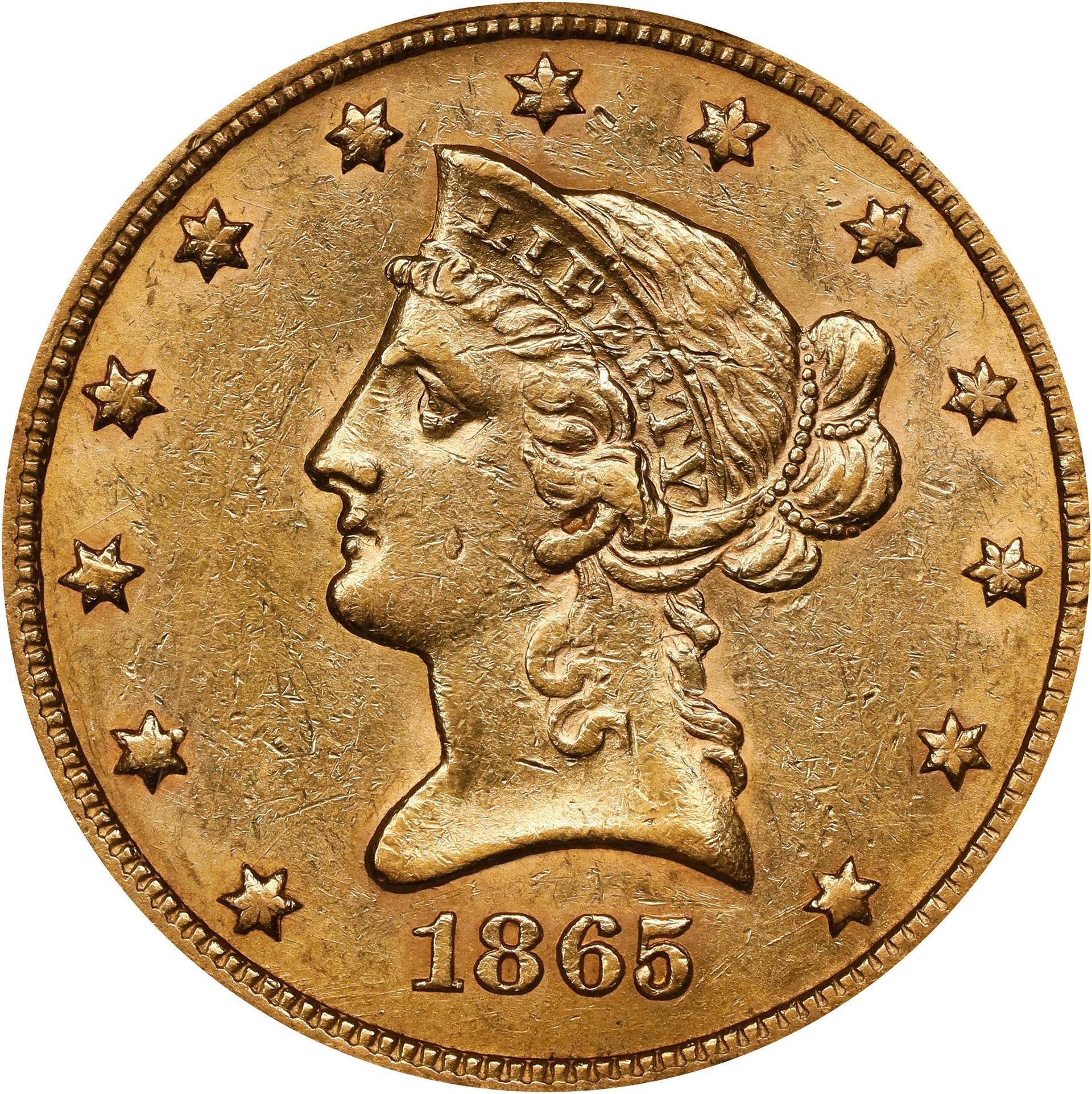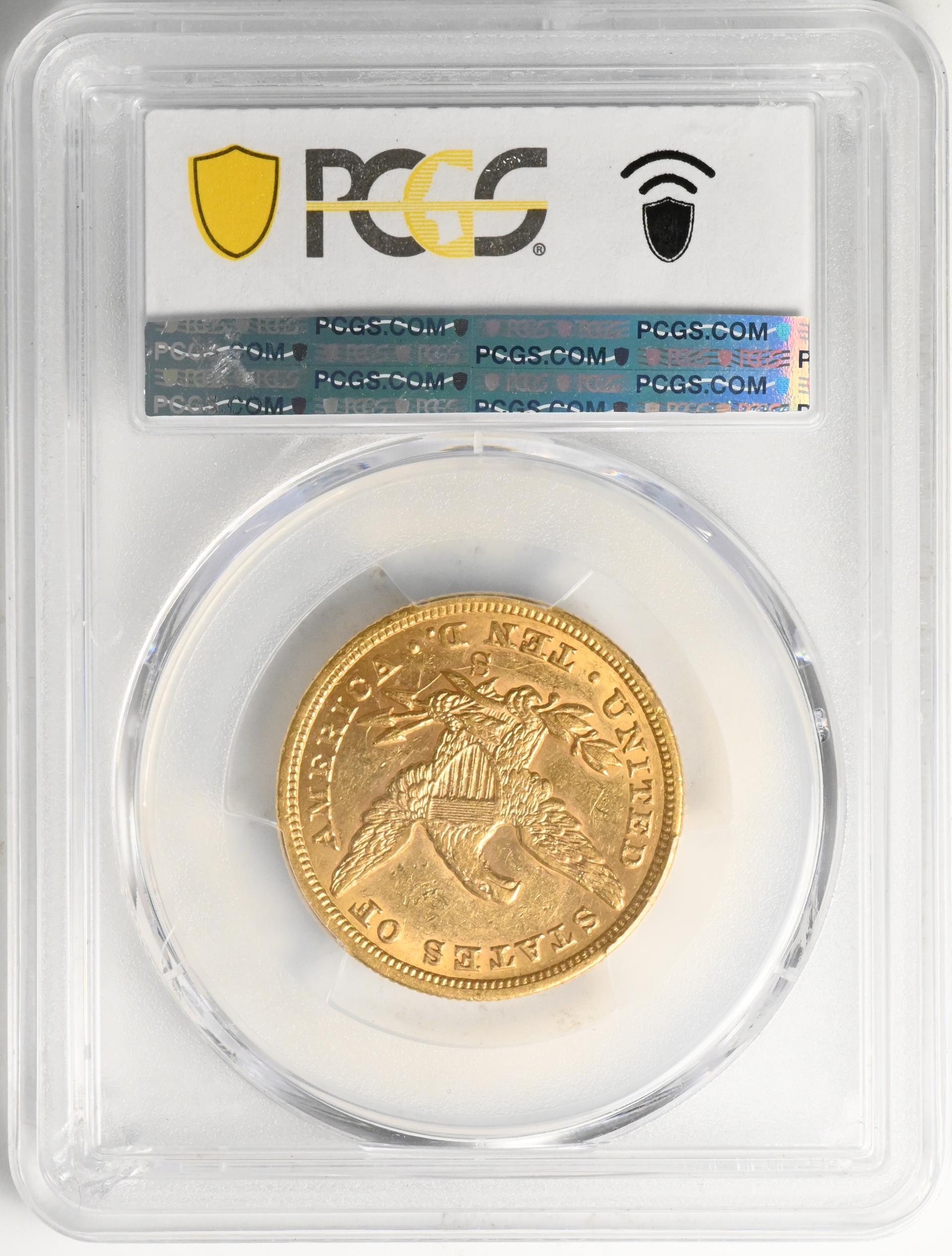 The eagle issued since 1838 was the Christian Gobrecht designed Coronet Head, featuring a neoclassic head of Liberty adorned with a coronet inscribed LIBERTY. 13 stars surround the bust, with the date below. The reverse depicts an eagle holding arrows and an olive branch, encircled by the inscriptions UNITED STATES OF AMERICA and TEN D. Chief Engraver James Barton Longacre placed the new motto on a scroll over the eagle’s head. From 1866 through 1869, only Philadelphia (no mintmark) and the increasingly important San Francisco (S) branch struck this new design. Production began at Carson City, Nevada (CC), in 1870 and continued through 1893. New Orleans (O) coins appeared in 1879, and the new Denver (D) facility began mintage in 1906. Mintmarks are found on the reverse, below the eagle.