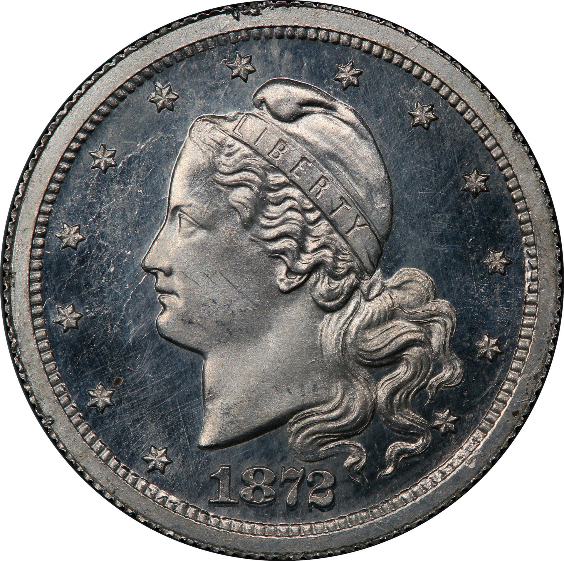 By 1861, as the dark cloud of the Civil War descended upon the nation, experiments with religious mottos accounted for many new proposals. After the motto IN GOD WE TRUST was adopted in 1864-66, designs for a new nickel five-cent piece took center stage. It was around this time that aluminum was first used in the Mint, and complete sets of the regular issues in that metal were made, reportedly for Mint Director Henry R. Linderman. It was on Linderman’s watch that restrikes of both regular issues and patterns really came into full swing. Unlike his predecessors, who sought only to embellish the Mint’s own collection, Linderman was not at all reluctant to have coins struck on his own behalf. One conduit through which these pieces left the Mint was Philadelphia pharmacist and numismatic “insider” R. Coulton Davis (1813-1888). Davis published the first catalog of U.S. pattern coins as a series in the American Journal of Numismatics, 1885-87. The late Walter Breen attributed Davis’ favored status to his willingness to supply key personnel with opium-based patent medicines then in widespread use.