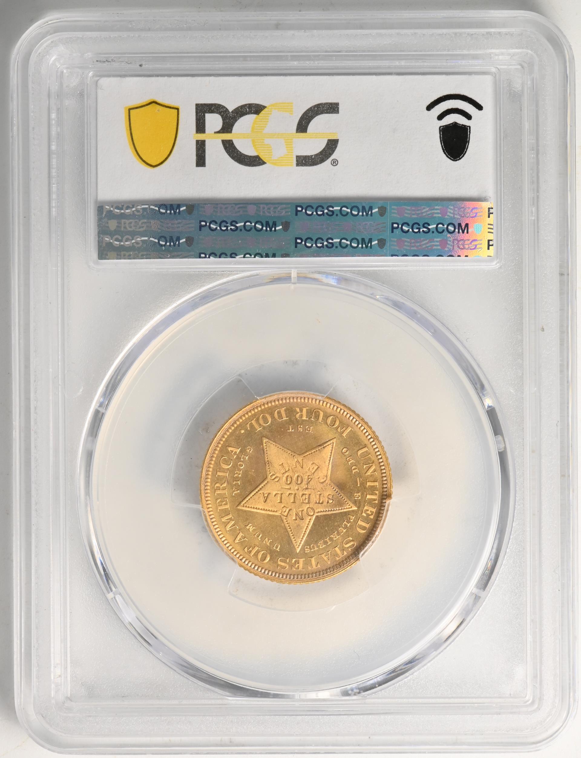 Although all four-dollar gold pieces are patterns, they have nevertheless been incorporated into the regular series of U.S. coins, similar to 1856 Flying Eagle cents, Gobrecht dollars and Wire Edge Indian Head eagles. Because of their rarity, however, they are usually collected as type coins. Only a few wealthy and determined collectors have ever been lucky enough to be in the right place at the right time to put together a complete four-piece set of these historic coins. At the time they were made, stellas were very popular with collectors, but with the extremely low mintages, there were not enough pieces to go around. In the early 1880s, newspapers reported that while an average collector could not acquire a four-dollar gold piece from the Mint at any price, looped specimens could be seen hanging around the necks of madams operating some of Washington’s most famous bordellos.
