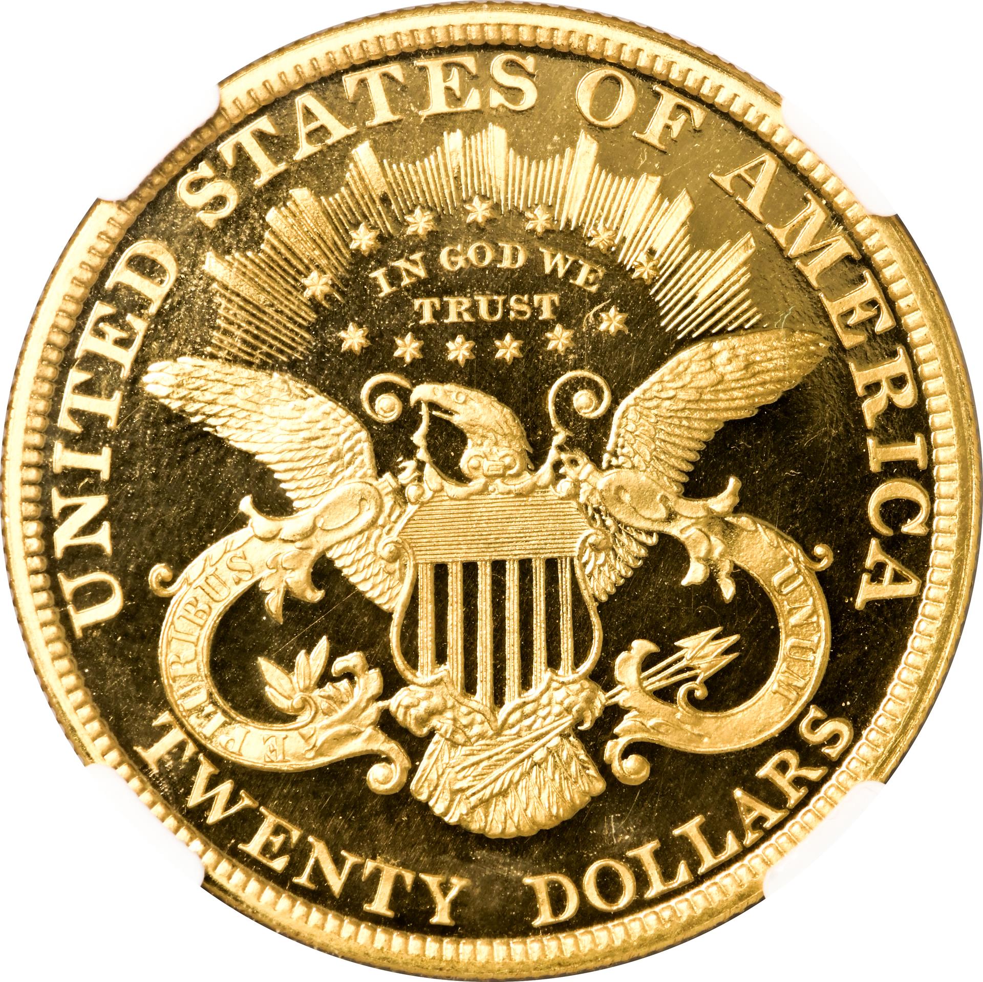 The modified design of 1866 only lasted 11 years until changed again in 1877, this time by spelling out TWENTY DOLLARS in place of the TWENTY D. of the two previous issues. The Type 3 twenty would continue in production until 1907, when President Theodore Roosevelt committed his “pet crime”—directing a change in U.S. coin motifs, and engaging well-known artists to render designs. The resulting design by Augustus Saint-Gaudens for the twenty dollar gold coin was heralded as the most beautiful in U.S. history, and was used until 1933, when all U.S. gold coin production ceased.