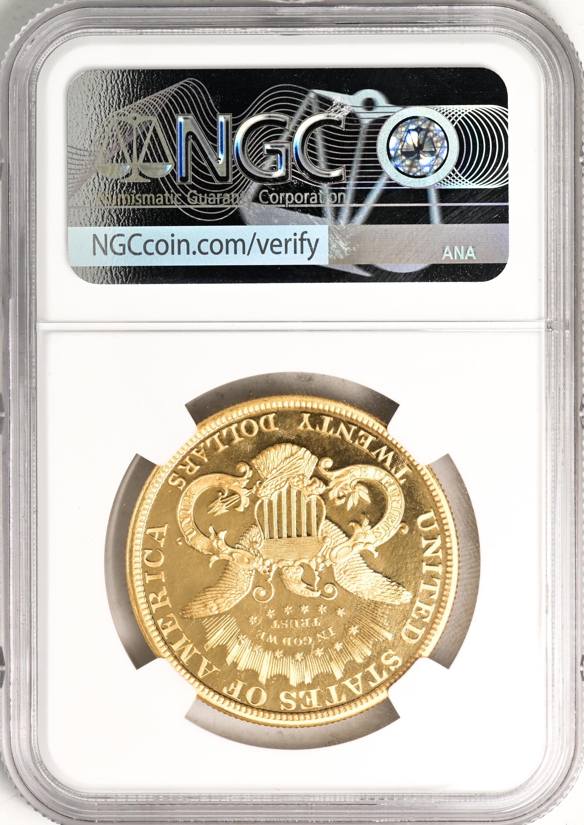 The new motto was first added to dies for double eagles in 1866. The addition was relatively easy to accomplish by slightly widening the oval of stars above the eagle’s head and placing IN GOD WE TRUST within. Because of the double eagle’s larger size, the addition of the motto did not result in undue crowding of the devices as on the smaller, lower denomination coins. Mint Engraver James Longacre also made two other minor modifications to the reverse: the sides of the shield that were formerly straight, curve outward on the Type 2 coins, and the tail feathers of the eagle are lower and closer to the lettered devices on the lower reverse, requiring smaller mintmarks than on the Type 1 coins. Otherwise, the design was left virtually unchanged, with the large Greco-Roman head of Liberty on the obverse surrounded by thirteen stars, and a heraldic eagle in the center of the reverse, with the oval of stars above and a glory of rays above that.