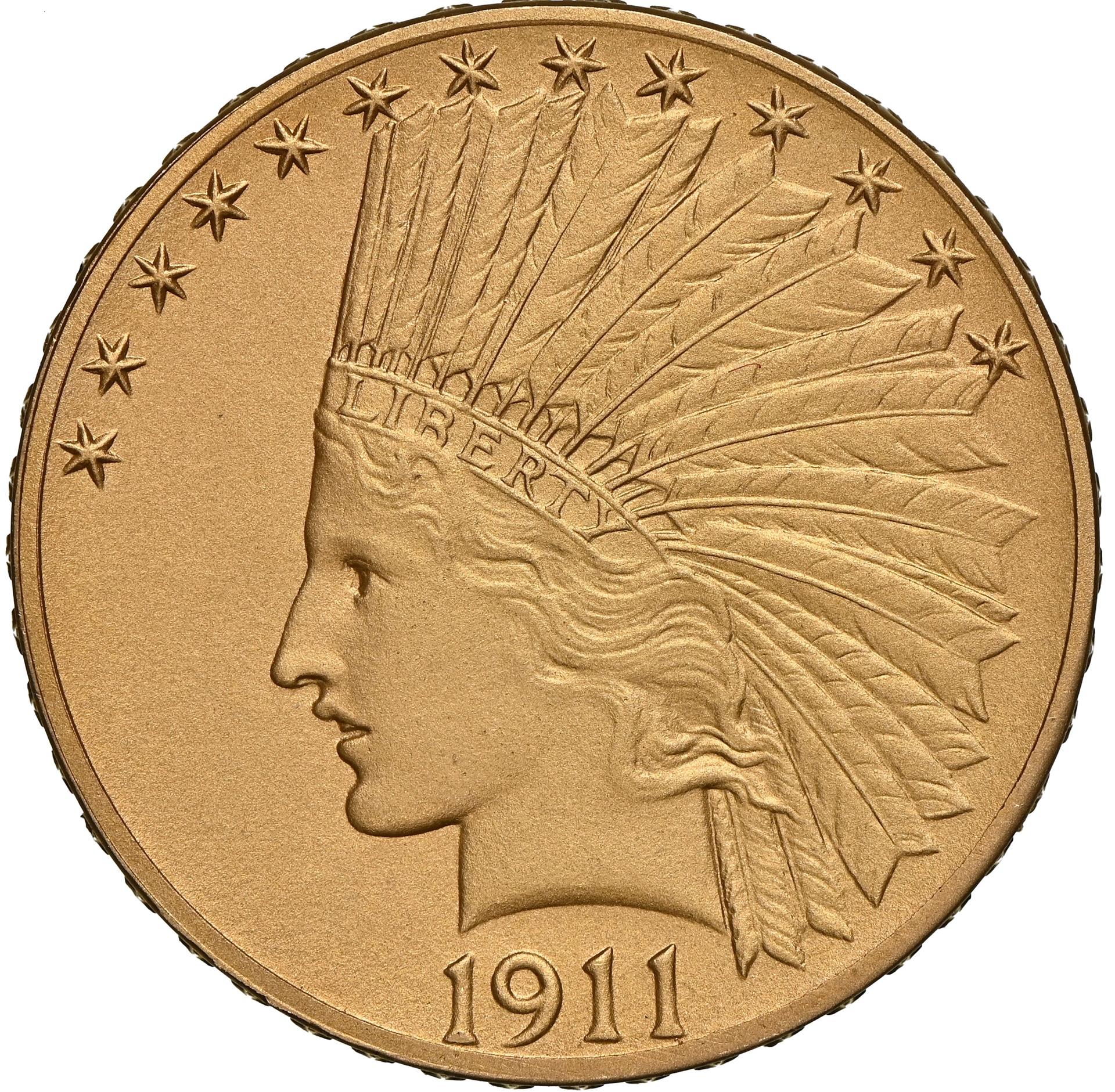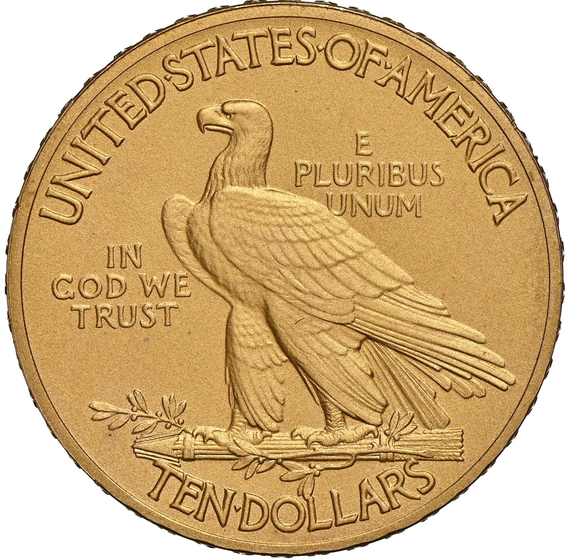 The bust on the new eagle was almost identical to the Nike head (Victory) that Saint Gaudens designed for Sherman’s monument in New York’s Central Park. At Roosevelt’s insistence, she shed her laurel crown for a handsome, but historically impossible Indian feathered war bonnet. LIBERTY was inscribed on the Indian’s headdress, with 13 stars above the head and the date below. The reverse’s eagle stands on a bundle of arrows, with the motto E PLURIBUS UNUM to the right. Encircling the periphery above the eagle is the legend UNITED STATES OF AMERICA. Below is the denomination TEN DOLLARS.