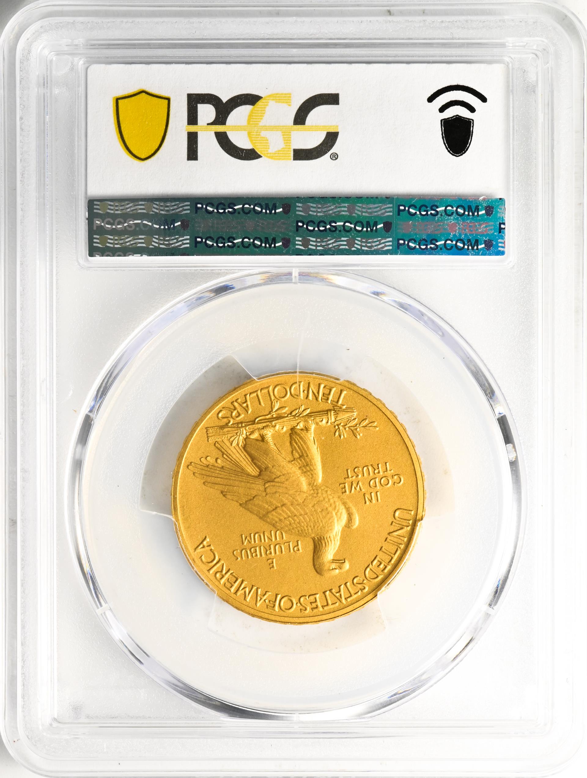 Lower relief than that demanded for Saint-Gaudens’ controversial high relief double eagle made it possible to begin minting the new $10 coins in 1907. First to be struck were the “Wire Edge” pieces, without the raised rim traditionally on U.S. coins. Five hundred were made, with 46 raised stars on their edges—symbolizing the 46 states—along with one plain-edge satin proof. These all bore triangular “periods” in legend and motto. The wire edge proved impractical, however, since the coins would not stack. Next, 31,550 pieces were struck retaining the triangular periods, but both sides were protected by a “Rolled Edge”—the sharply raised rims ordinarily used. Unfortunately, this change resulted in unsatisfactory striking quality. Rather than release these coins to possible public criticism, officials decided to melt all but 42 pieces. Ironically, this coin was intended for circulation, and although never officially released, it is considered a business strike—not a pattern.