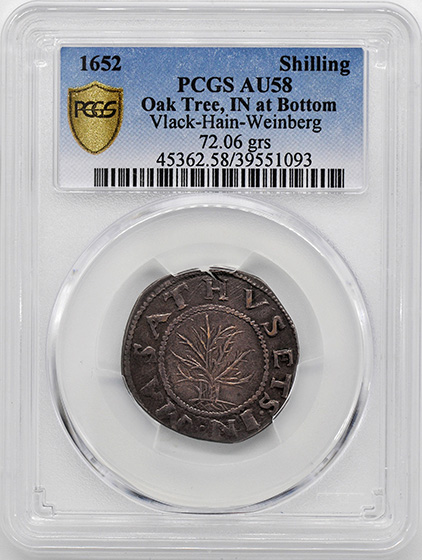 The mint’s first silver shillings bore simply the letters NE (for New England) on the obverse and the values XII (12 in Roman numerals), VI (6) or III (3) on the reverse. Easily counterfeited or clipped, these coins were quickly replaced by ones featuring a tree on their obverse. Three styles of trees were used over the thirty years of production: a willow (1652-60), an oak (1660-67) and, most familiar of all, a pine (1667-82).
