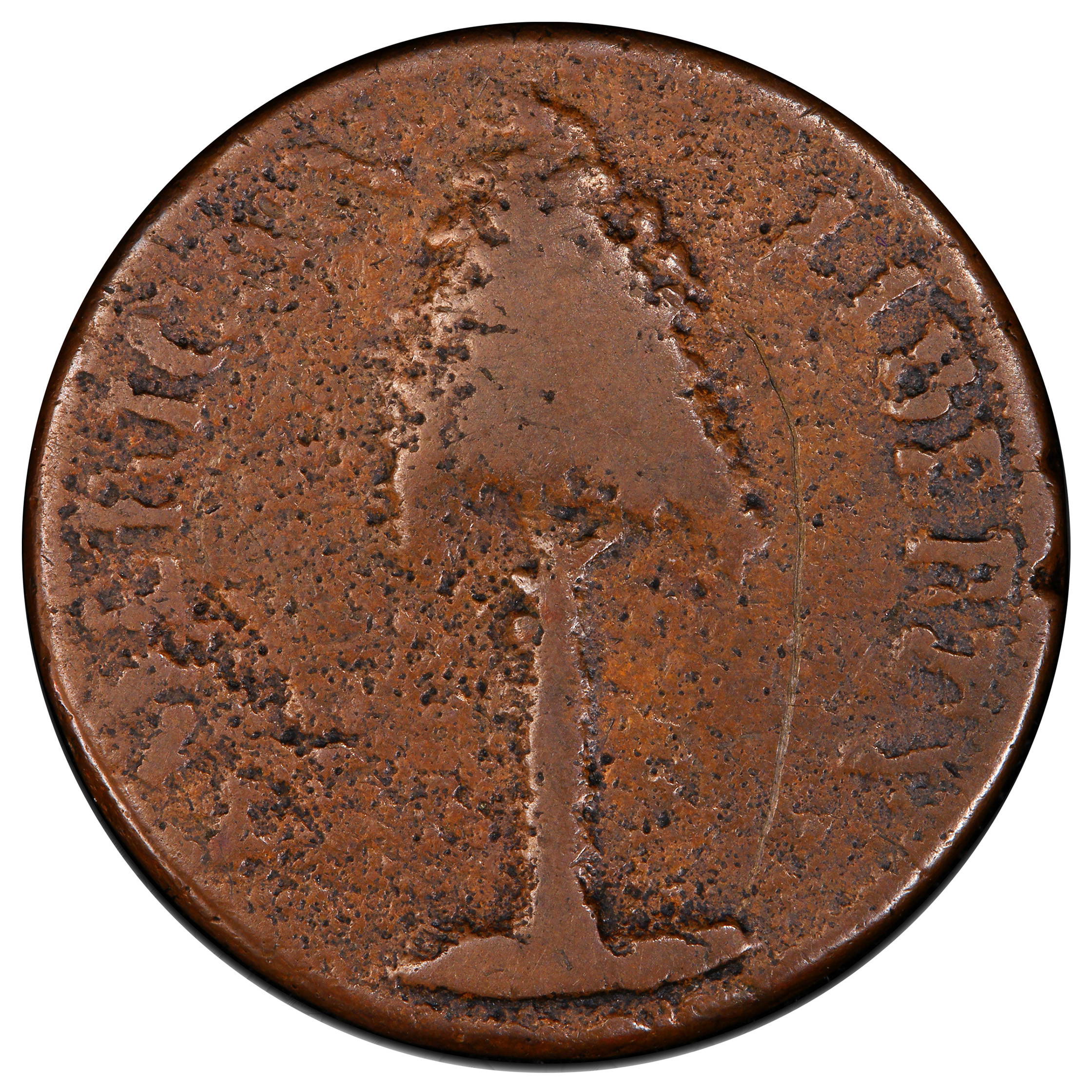 Tokens honoring Sir William Pitt, who defended the American colonists against the unpopular Stamp Act of 1765, were made in both farthing and halfpenny sizes bearing the date 1766. A bust of Sir William appears on the obverse, while the reverse features a merchant ship under full sale, which is identified as AMERICA. The Pitt Tokens are quite collectable and serve as important historic relics.