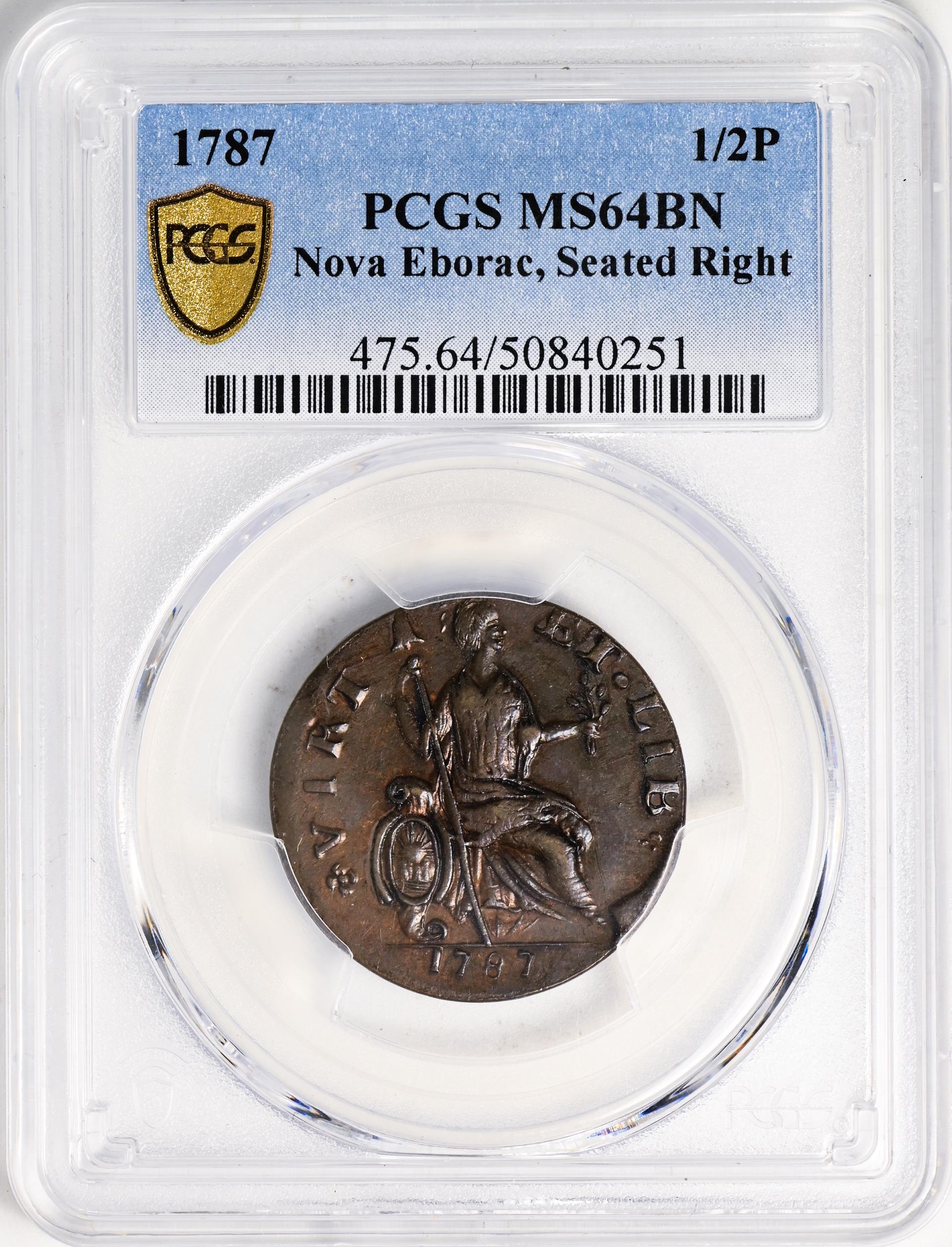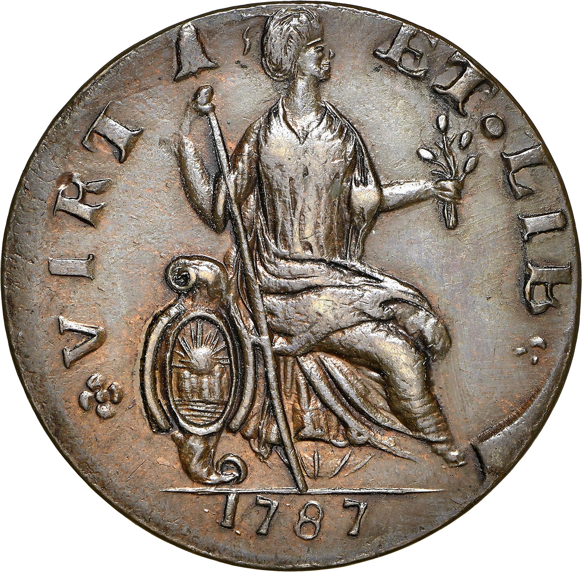 Of all England's American colonies, Virginia came closest to realizing a useful coinage from the Mother Country, but it simply came too late. In 1773, thousands of copper halfpennies were minted in London for shipment to Virginia. These attractive coins carry the portrait of King George III on their obverse and the royal arms of Great Britain on their reverse. Thanks in large part to the discovery of a hoard of uncirculated specimens, Virginia halfpennies are readily available in Mint State grades. The Virginia halfpennies are among the most common colonial era coins, and they are a perennial favorite with American collectors.