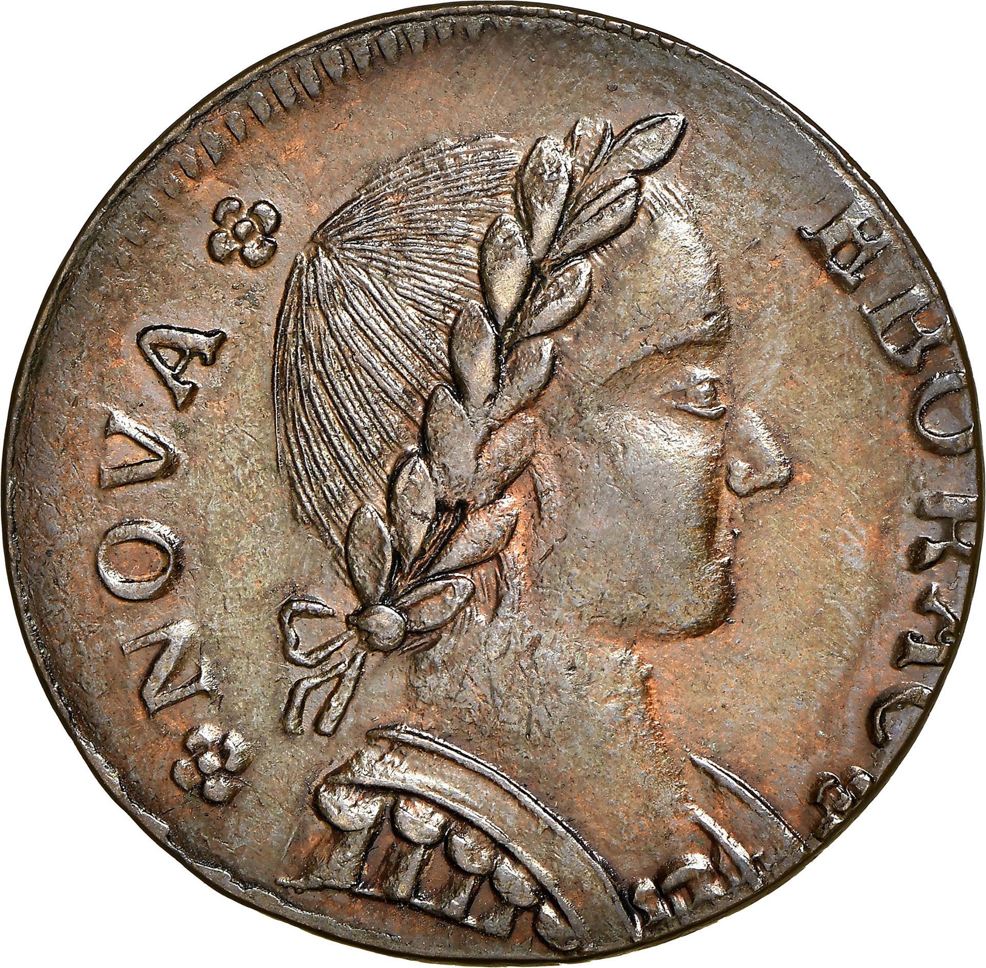 Among the rarest and most obscure colonial pieces are the brass and pewter tokens issued by Francis Lovelace, governor of New York from 1668 to 1673. The New Yorke token is undated but is believed to date from this period. Its obverse shows Cupid chasing after Psyche, who wears butterfly wings. The reverse features the Lovelace Family arms, which is dominated by an eagle. Probably intended to pass as farthings, these extremely rare tokens are believed by some to have been made in Bristol, England.
