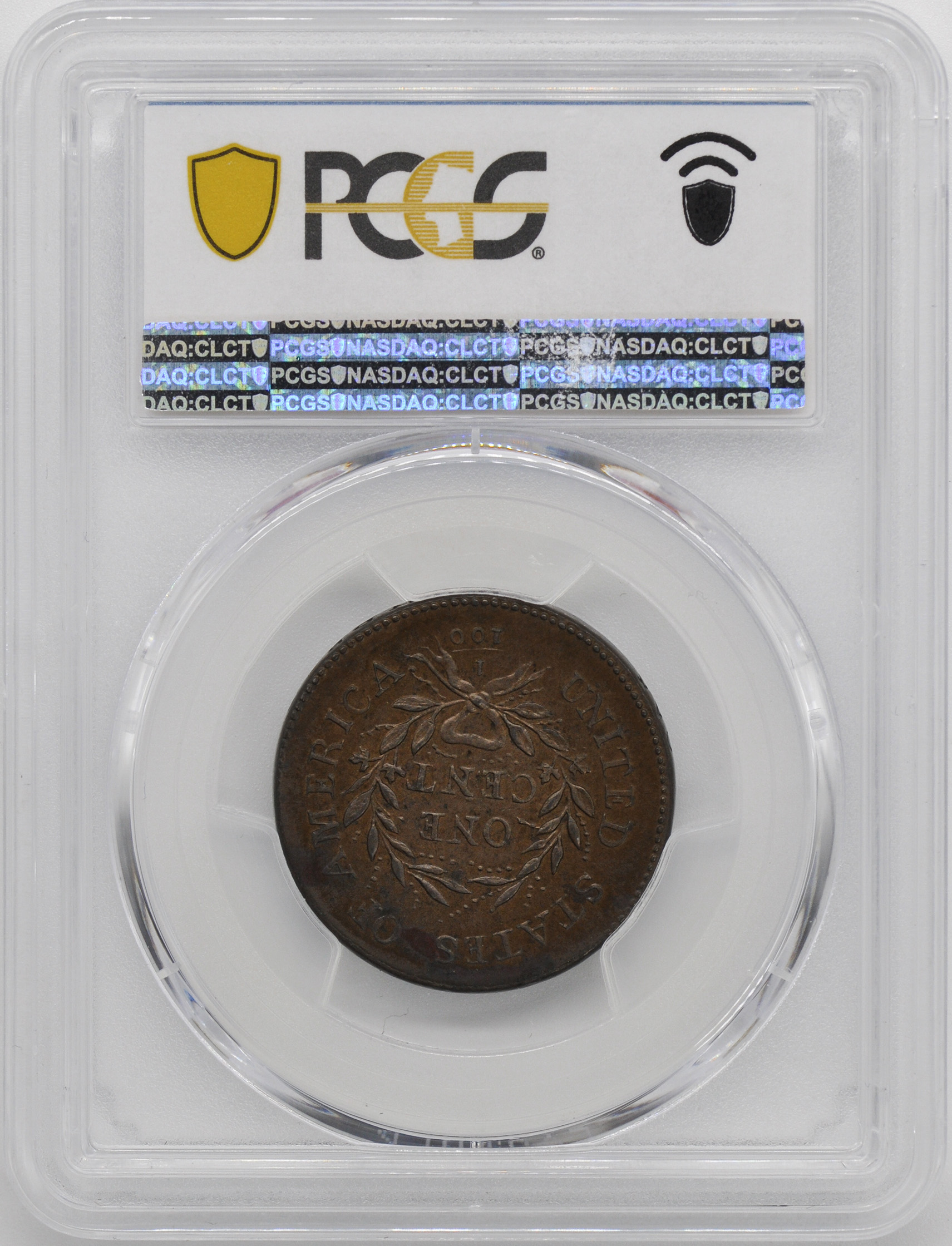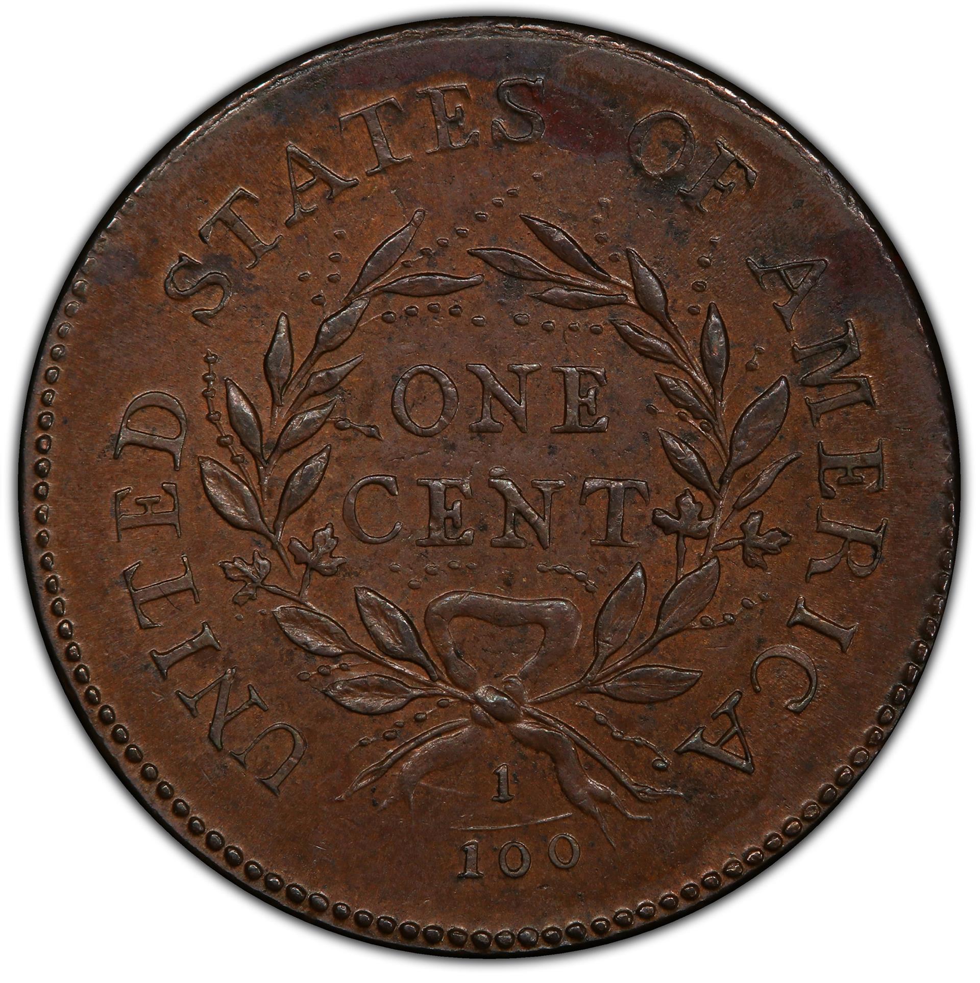 A small fraction 1/100 appears below the bow, a reminder to most Americans then living that the new nation’s coinage was decimal. Another reminder appeared on the edges of some varieties, the incuse message ONE HUNDRED FOR A DOLLAR, followed by either one or two leaves. A third edge type is the ornate Vine and Bars design, and the Sheldon 11 variety is known with all three edges!