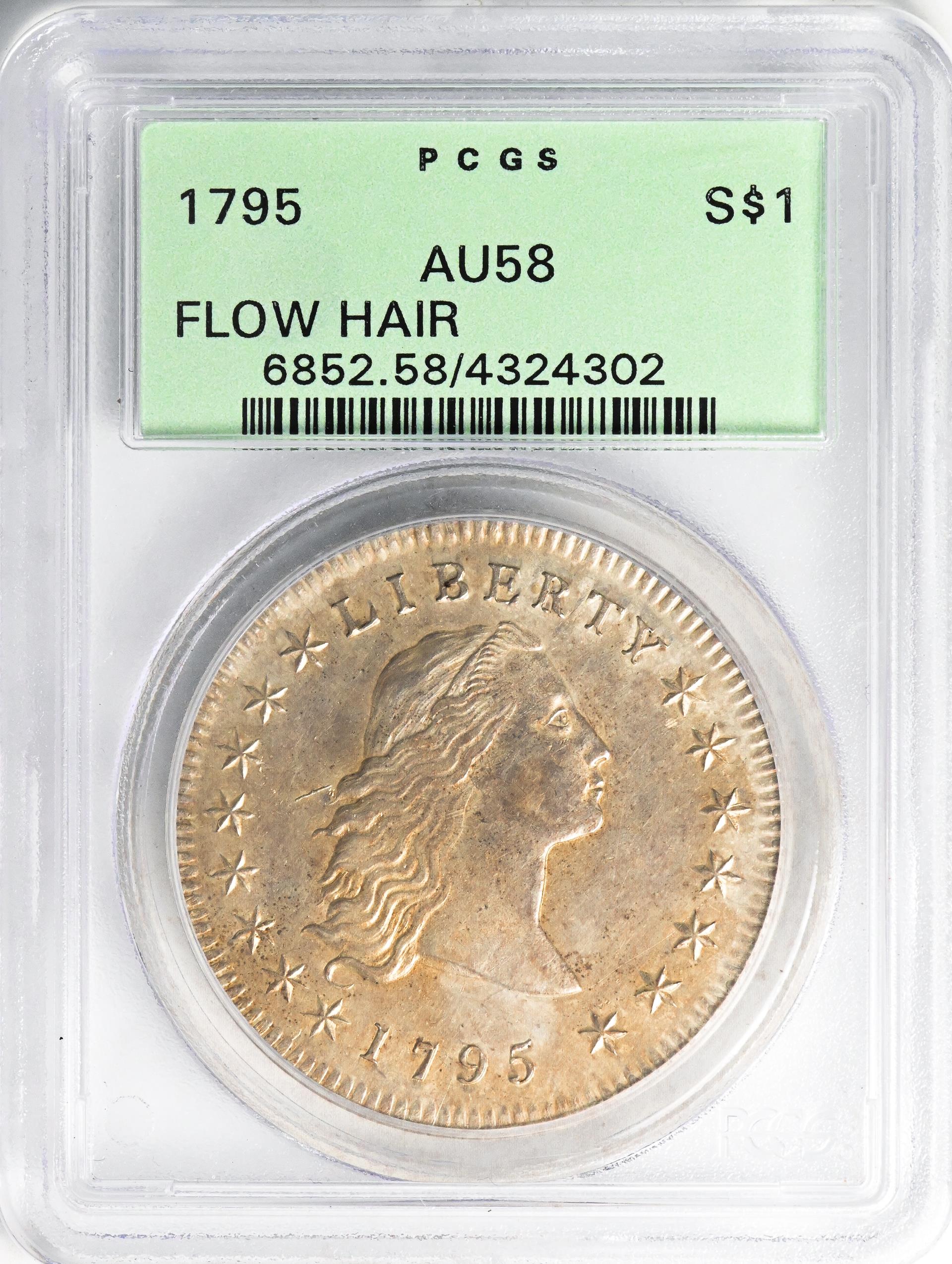 Despite its brevity, the Flowing Hair dollar series is widely collected by type (most collectors selecting the 1795 issue, because it is so much more plentiful than 1794). Some of the 1795 dollars have two leaves below each wing of the eagle, while others have three. Both kinds are equally available, however. There are no records of proofs for either year, but some 1795 dollars are purported to be “specimen” strikes. Mint state pieces of both dates are very rare. Points to first show wear are the cheek, shoulder and hair above Liberty’s forehead and the eagle’s breast, head and wing-tops.