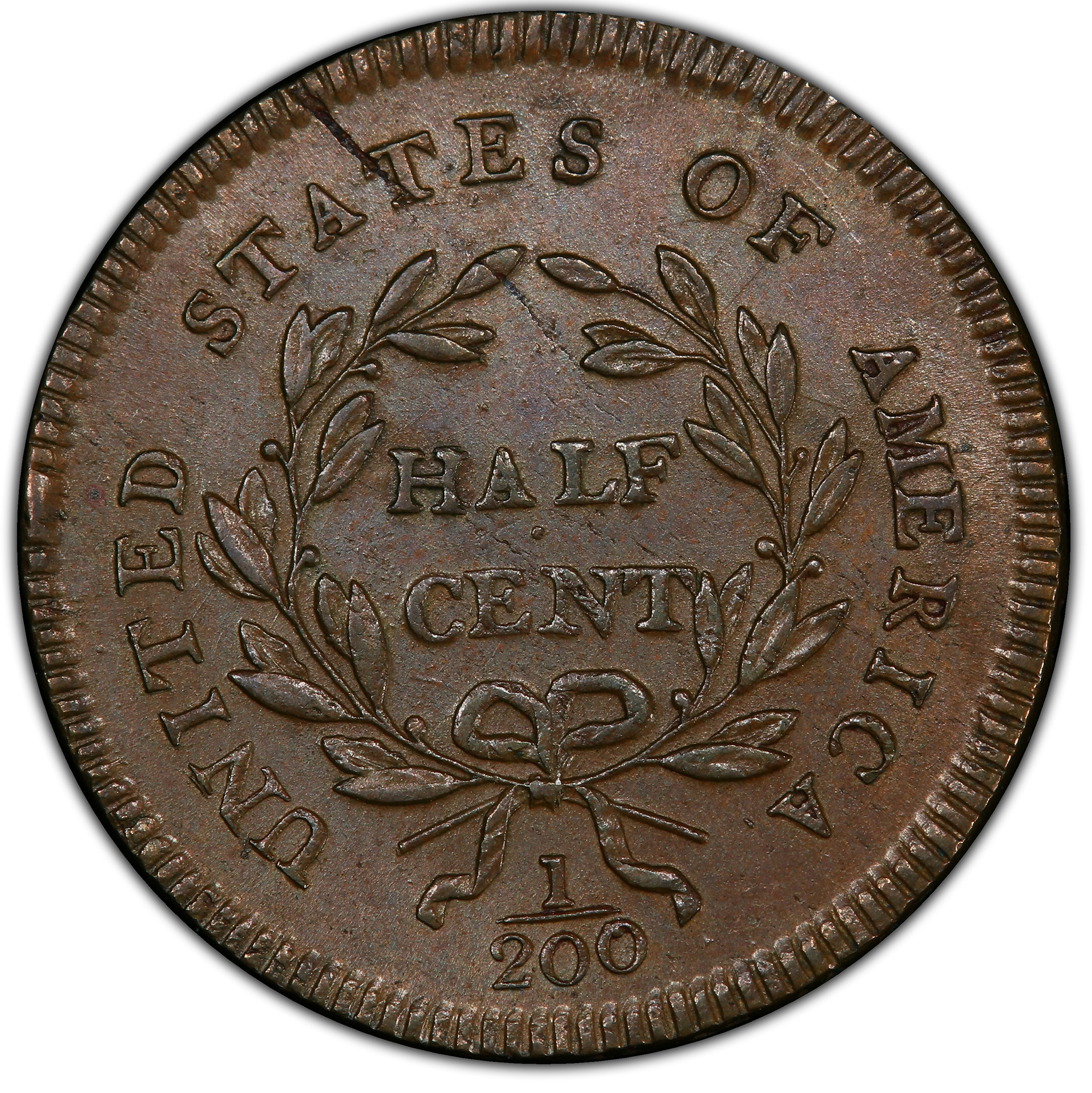 The design depicts an idealized head of Liberty facing left, with a large, floppy Phrygian cap on a pole in the background. This was the soft cap worn by freed Roman slaves. It celebrated newly achieved freedom and hid the close-cropped haircut that identified slaves, even as a striped uniform would one day identify escaping convicts. The inscription LIBERTY appears above the bust, the date 1793 below. The reverse, which Eckfeldt fashioned from sketches provided by Rittenhouse, features a laurel wreath of leaves and berries tied with a bow. UNITED STATES OF AMERICA and the fraction 1/200 surround the wreath, which encloses HALF CENT. A beaded border encircles the periphery on both sides of the coin, and the edges bear the incuse inscription TWO HUNDRED FOR A DOLLAR followed by two leaves. This single issue has four major varieties based on the size and location of the fraction, period after AMERICA and the presence and size of a center dot between HALF and CENT.