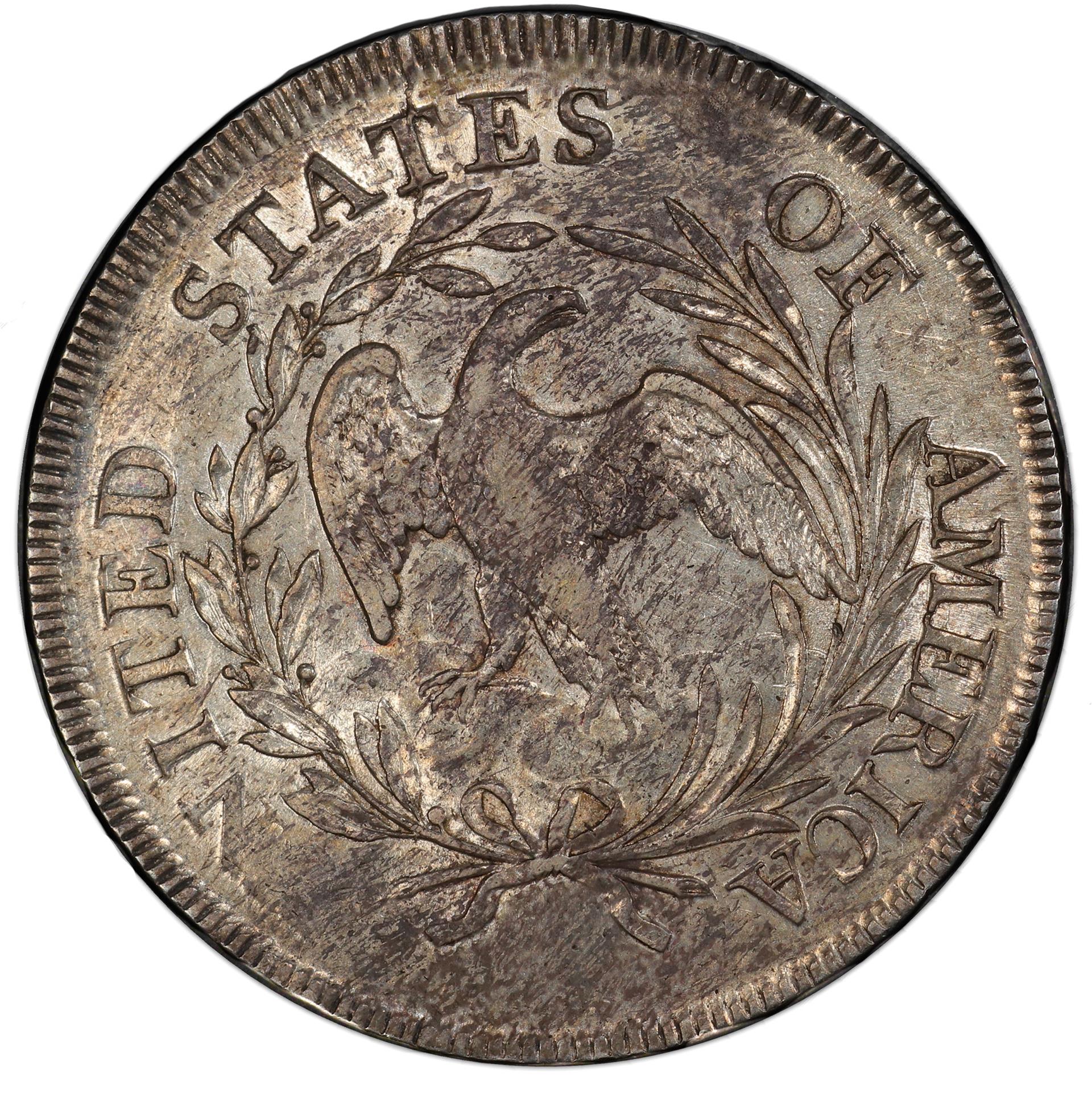 Though the Flowing Hair portrait of Liberty was retired, the Mint kept the reverse essentially the same. It features a small, naturalistic eagle encircled by a wreath, with UNITED STATES OF AMERICA inscribed around the border. On the Draped Bust coinage, this “Small Eagle” reverse does reveal subtle refinements: The eagle seems more graceful, for example, and it’s perched upon a cloud instead of a rock (as had been the case on the Flowing Hair coinage). In addition, the wreath has been modified: The previous laurel branches have given way to branches of palm and olive. LIBERTY and the date are the only inscriptions on the obverse. Lettering on the edge proclaims the statement of value: HUNDRED CENTS ONE DOLLAR OR UNIT, with decorations separating the words.