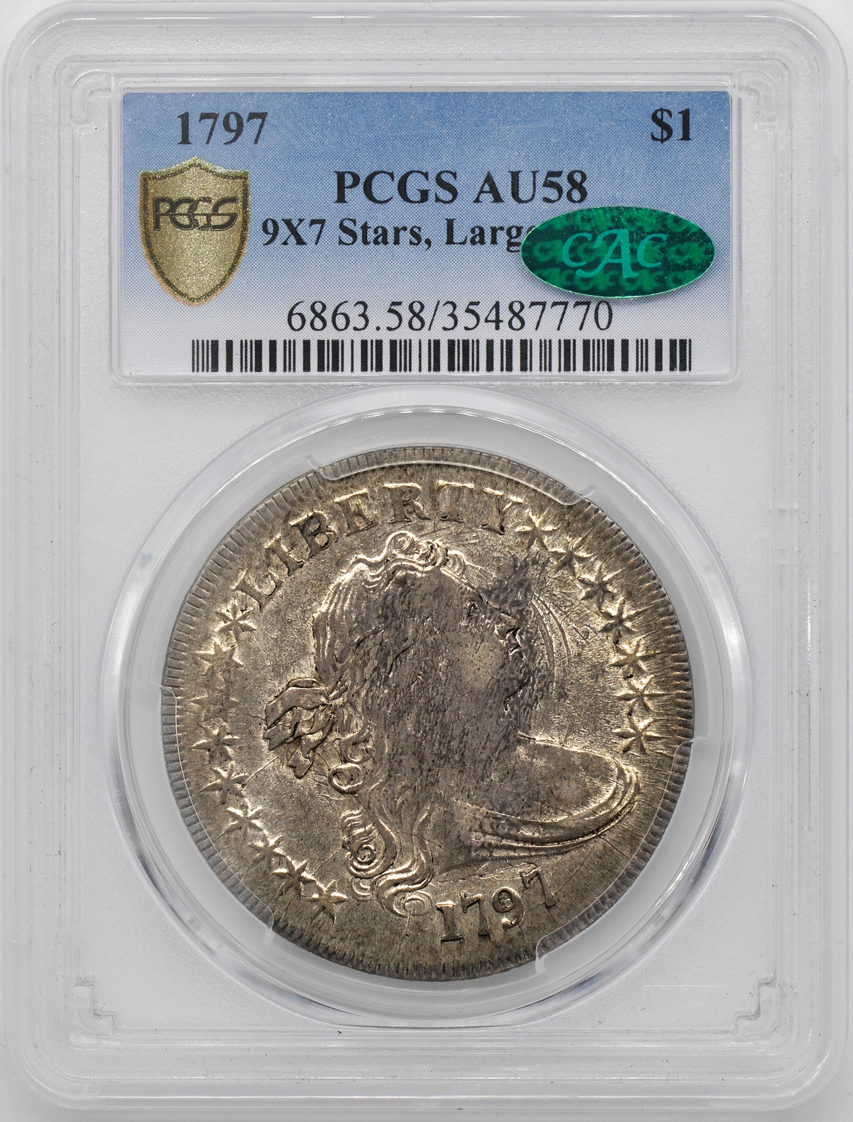 Only about 450,000 Draped Bust/Small Eagle dollars were issued in the four years combined, nearly three-fourths of them in 1798. Noted scholar Walter Breen estimated that just 3 percent survive. The low point came in 1797, when a mere 7,776 were produced. The rarest variety is the 1797 dollar with 9 stars to Liberty’s left, 7 to her right and small letters in the reverse legend. The low production figures are understandable, given the fact that during the 1790s a dollar represented a full day’s pay for some Americans—and a living wage, at that.