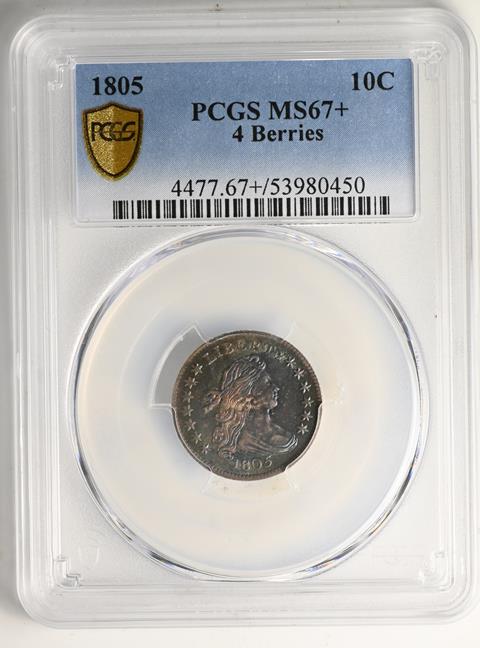 Even though it was short-lived, the series has many varieties, an inherent problem of issues produced with the relatively crude technology of the Mint’s early years. Major and minor design variations include overdates, differing sized date punches, thirteen- and sixteen-star reverses and four- and five-berry reverses. Curiously, Yeoman’s Guide Book lists fourteen date and variety combinations, Breen’s Encyclopedia lists seventeen and the bible of avid dime variety collectors, Early United States Dimes 1796-1837, lists twenty-one. So, depending on your aspirations, it’s possible to have a “complete” set of Draped Bust/Heraldic Eagle dimes with anywhere from eight pieces (one for each year issued) to twenty-one pieces (the number of varieties recognized by advanced specialists).
