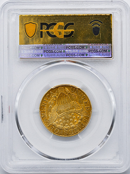 Only 18,512 Draped Bust/Small Eagle fives were produced from 1795 through 1798, and most didn’t escape the huge melts that later destroyed the bulk of U.S. gold coinage minted before 1834. Survivors, particularly in high grade, are very scarce. By far, the most common date of the series is 1795: With 8,707 minted and many saved as first year of issue “souvenirs,” this is the date seen most often in type sets. It is generally found with bright, prooflike fields, and often with lint marks—vestiges of lint from the soft cloths used to frequently wipe and polish the dies. Choice mint-state specimens exist but are very rare. Even the seven examples of this date in the famed “Eliasberg Sale” only ranged from XF to AU. An interesting error of this year is the S over D variety, a blunder created when the word STATED was first punched into the reverse die and then corrected by overpunching the D with an S.