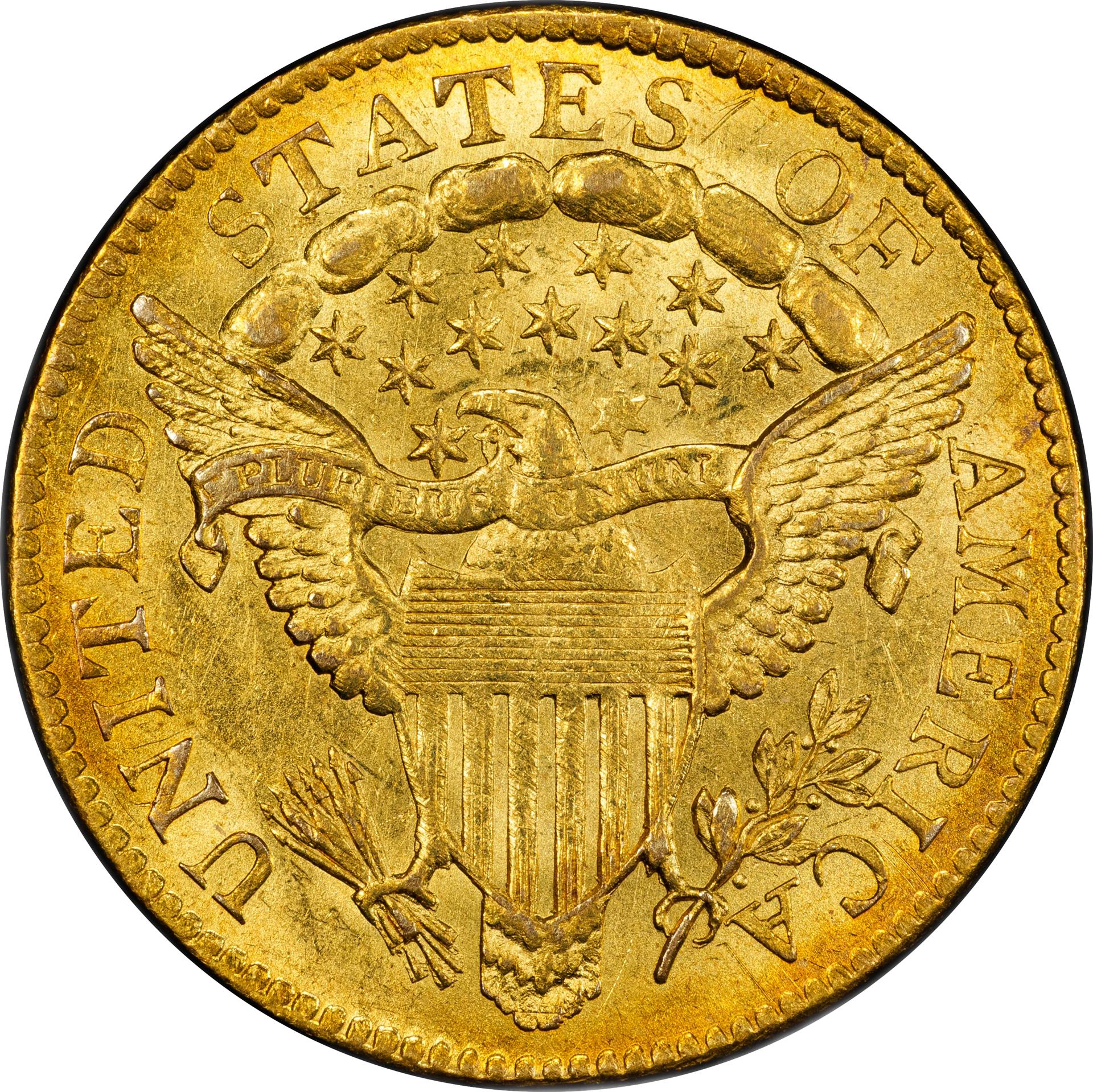 The final Quarter Eagle of the Capped Bust Right type, the 1807 is also the most frequently encountered in today's market.  Perhaps understandably, it is a perennially popular coin among gold type collectors.  As with all early gold issues, however, the 1807 Two-and-a-Half is still an elusive coin when viewed in the wider context of numismatics.  We believe that just 250-350 examples have survived from an original mintage of 6,812 pieces - a total that would confirm the 1807 Quarter Eagle as a major rarity in most other U.S. coin series.