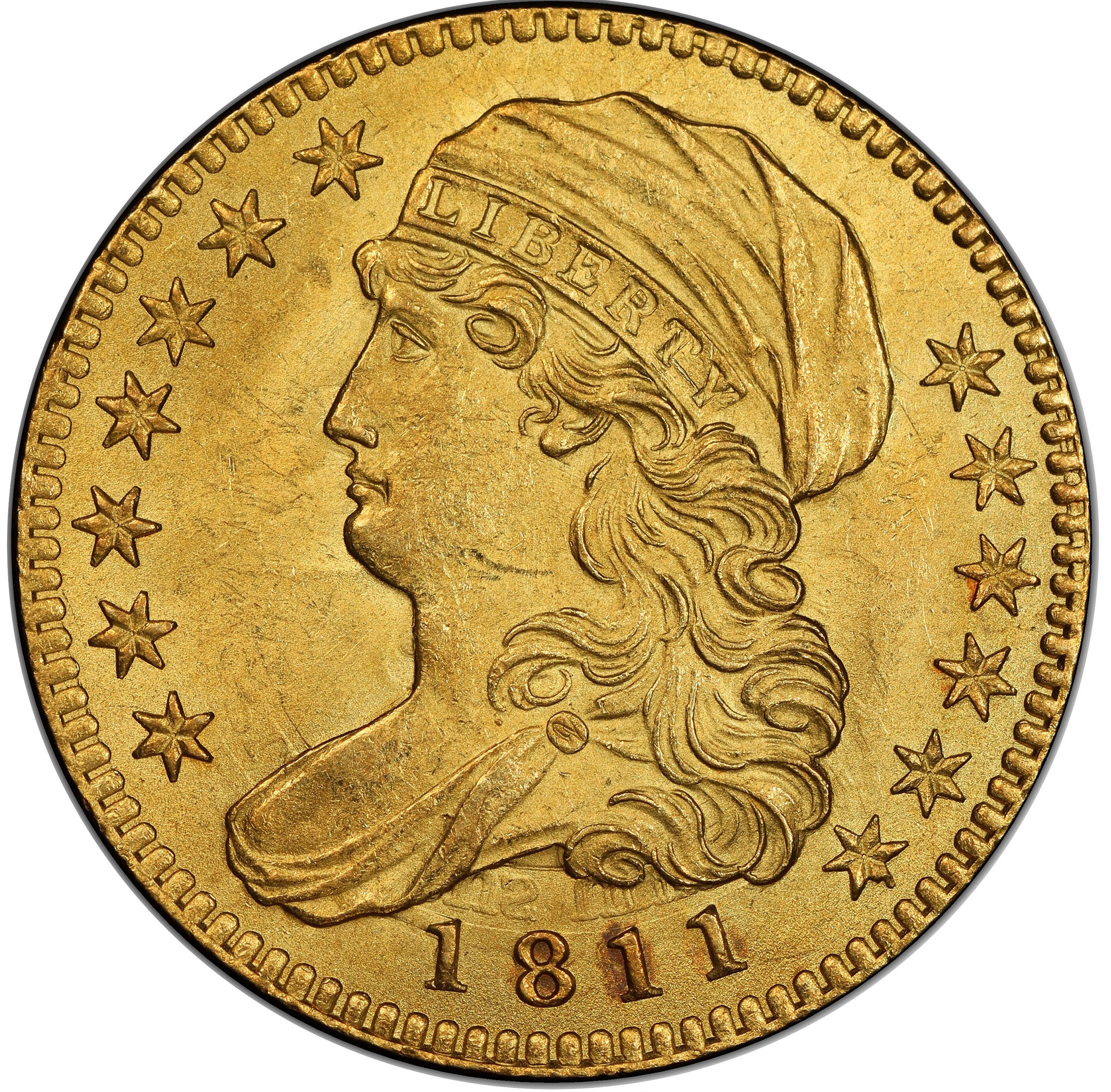 The Philadelphia Mint struck only 399,013 half eagles of this type between 1807 and 1812, and many were melted in later years, suffering the same fate as most U.S. gold minted before 1834. Possibly 1% of the mintage survived, mostly as curiosities, along with a few examples saved by early numismatic pioneers. Although there are some very scarce varieties such as 1808/7 and the 1810 small or large dates with small 5, these are usually only of interest to the dedicated specialist. Complete date sets are within the reach of many collectors, although the design is generally collected as a “type.”