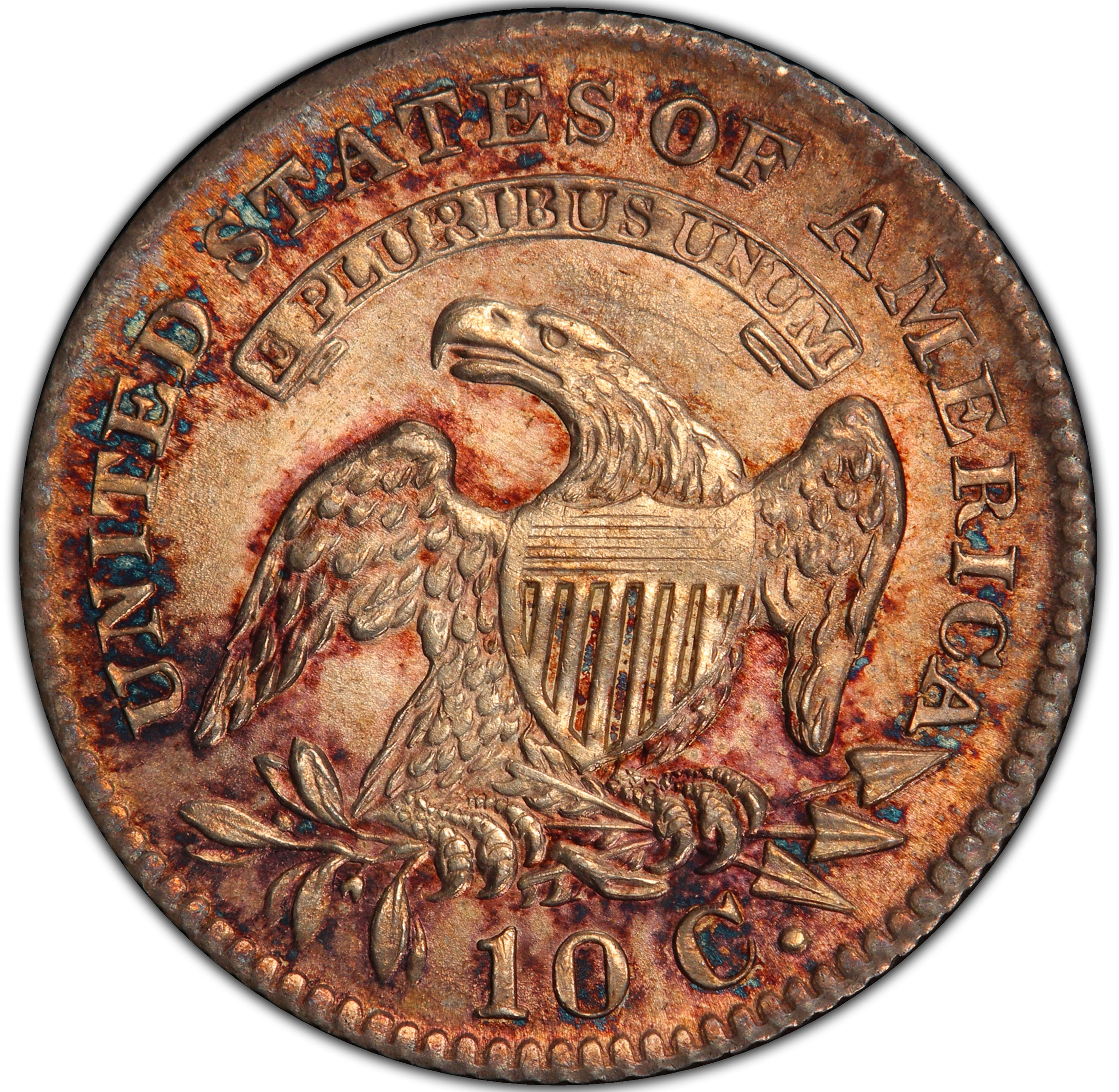 The reverse bore an American eagle with head turned left, holding three arrows symbolizing strength, and an olive branch representing peace. On its breast is the Union Shield composed of six horizontal lines indicating blue, with 13 stripes below, six of these made of three vertical lines each indicating red. Such lines were an 18th century engraver’s standardized method of showing colors in black-and-white engravings; blue representing dominion, red signifying force, with white denoting purity. Encircling the top of the eagle is the inscription UNITED STATES OF AMERICA and a scroll with the incuse motto E PLURIBUS UNUM. Beneath the eagle is the denomination 10 C.