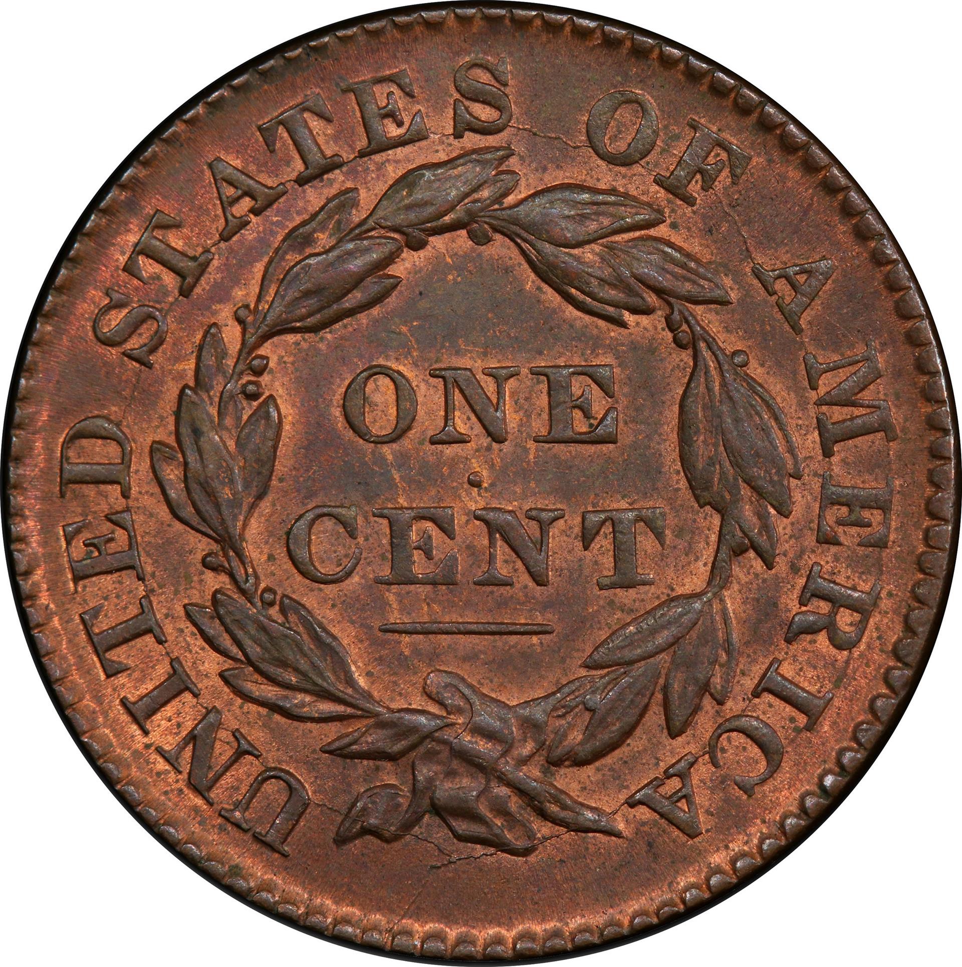While none of the dates in the series are outstanding rarities, the “key” date is 1823. It is scarce in all grades. Although counterfeits in the series are rarely seen, several generations of restrikes for the 1823 cents exist, each with successively larger and larger die breaks on the obverse. The years of 1835 through 1839, redesigned by either William Kneass before his stroke or Christian Gobrecht afterward, are considered transitional. While the design differs in several significant aspects, these years are generally collected within the Coronet series. In 1839, four different varieties were struck, among which are two of the most widely collected in 19th century numismatics: the so-called Silly Head and the Booby Head.