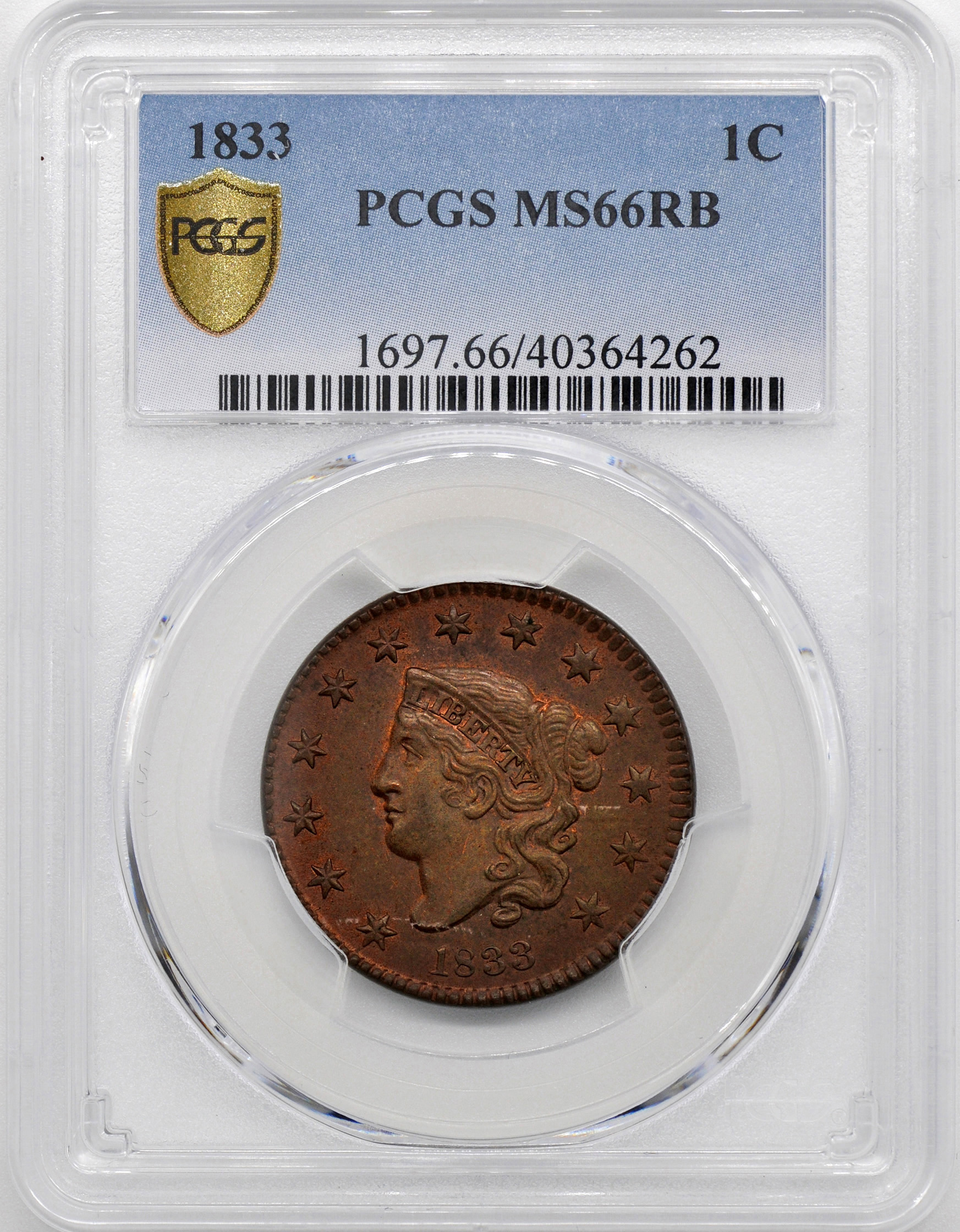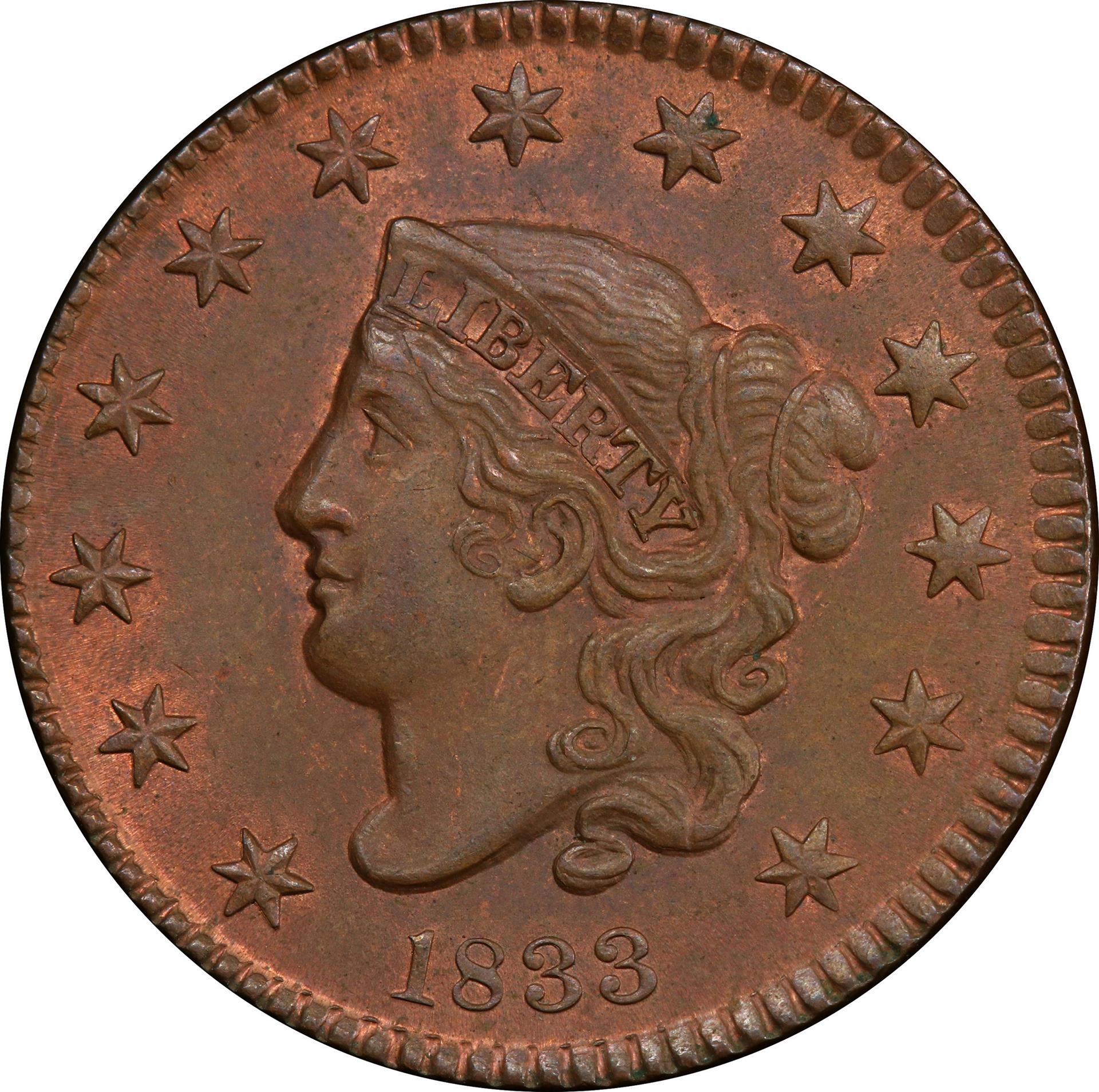 Due to a numismatically fortuitous event over 125 years ago, the condition conscious type collector will find this series particularly interesting. Shortly after the Civil War, a large keg was found beneath an old railway platform in Georgia. Upon opening, it was discovered to contain approximately 14,000 large cents dated from 1816 through 1820. All the coins were uncirculated, but many showed carbon flecks from moisture in the atmosphere. The keg was sold to a dry-goods merchant in Norwich, New York who attempted to pass the old coins out to customers as a publicity stunt, but many people refused what was by that time an unfamiliar coin. The remainder of the keg was sold to John Randall, a Norwich coin collector, for 90 cents on the dollar. Randall sold the coins off slowly over the years, in spite of the rumors that they were restrikes. In 1878, as part of Randall’s estate, the remaining 2,116 Coronet cents from the hoard were sold at public auction. The 1819s brought $1.28 each, but most of the other dates realized only 5-7 cents apiece. Almost all mint state cents from 1816-1820, many of which still possess original mint red color, are from Randall’s hoard. Dates from the 1820s, however, are quite rare in mint state.