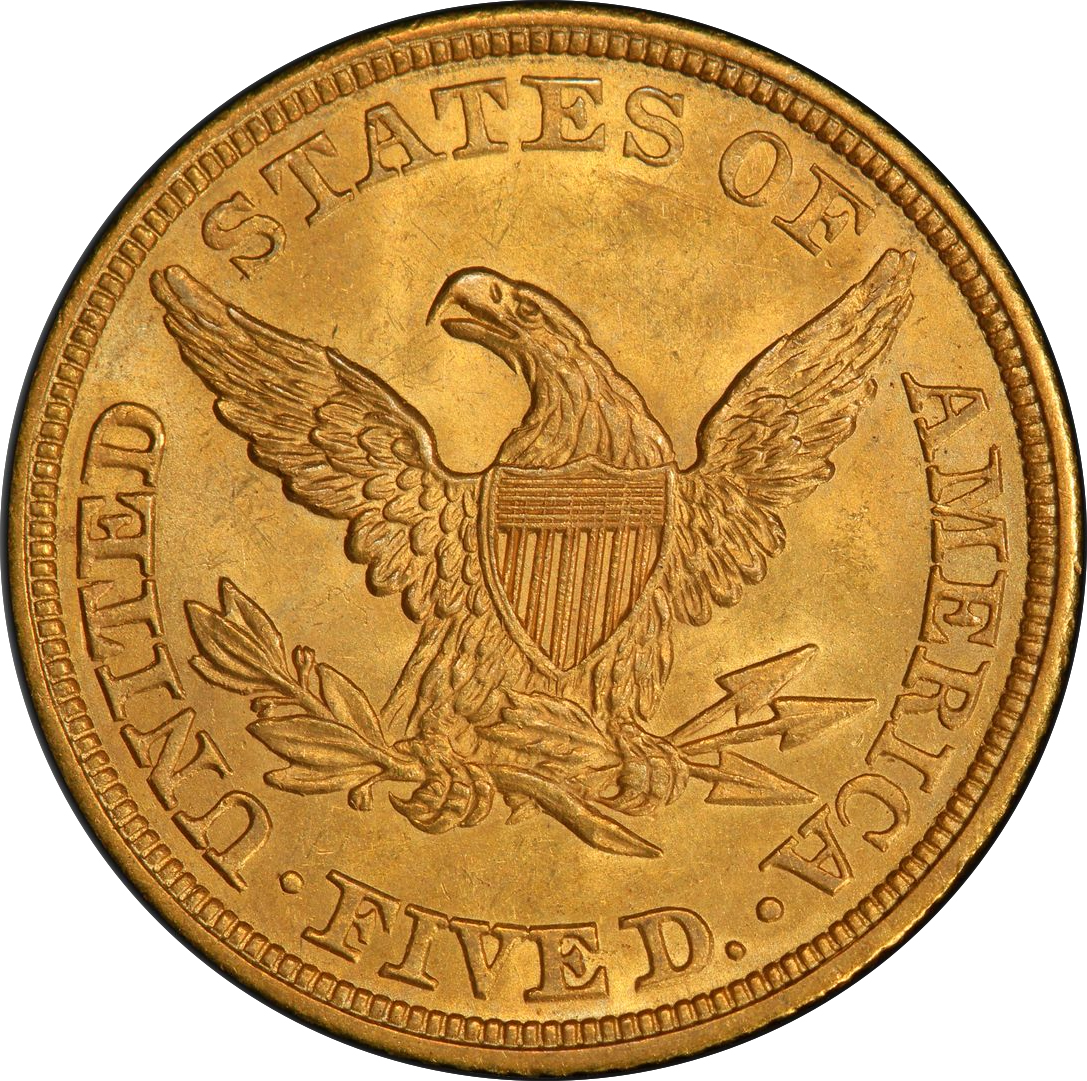 The mintage was large enough so that almost every date after 1878 is available, many in gem condition. Although most type collectors seek just one example each of the “no motto” and “with motto” types, a very popular collection is a set of Coronet half eagles from every mint. All would be “with motto” except the issues from the three southern mints, which generally would be “no motto” coins minted before the Civil War. The Coronet half eagle is unique in this respect, as it is the only coin struck at all seven mints—Philadelphia (no mintmark), Charlotte (C), Dahlonega (D), New Orleans (O), San Francisco (S), Carson City (CC) and Denver (D). Mintmarks can be found beneath the eagle.
