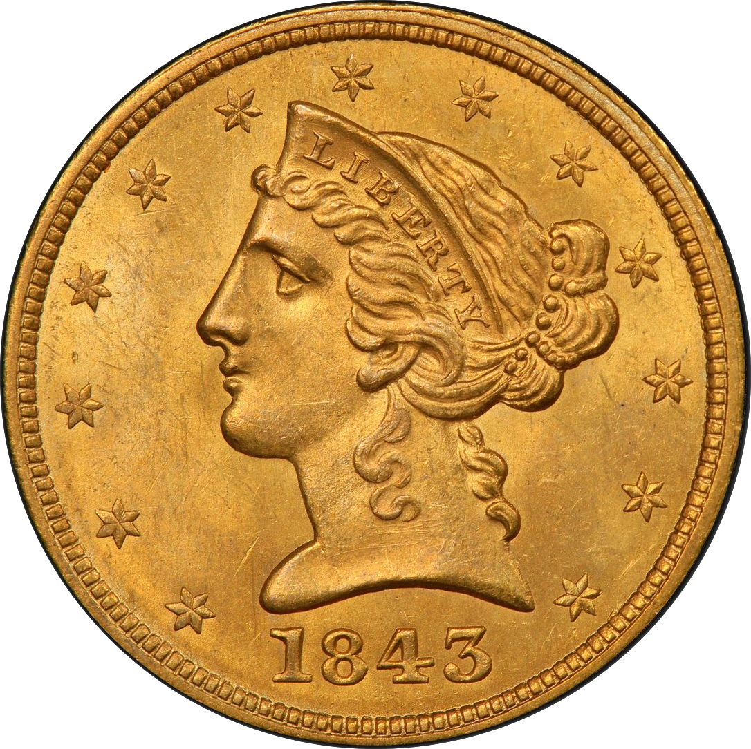 In the first several years of production minor design changes were made—the head of Liberty was modified slightly after 1839, the diameter was decreased in 1840, and lettering and dates were enlarged in 1842 and '43. For the date and mintmark collector these minor design alterations provide variety; although—primarily due to engraver James Longacre's ineptitude as a die sinker—there are a considerable number of mispunched dates and overdates within the series that also provide numismatic interest. But the true rarities in this series are the low mintage, low availability issues, especially the branch mint issues from Dahlonega and Charlotte, such as the 1842-D Large Date, the 1842-C Small Date, and the 1861-C. There are no standout rarities among the New Orleans issues except, of course, for the legendary 1841-O, a coin that is unknown in any collection even though mint records indicate 50 pieces were struck—presumably all were melted after coining. The rarest regular production No Motto half eagle comes from the San Francisco mint—the 1854-S. Only 268 half eagles were struck in this first year the San Francisco mint was in operation, and today only three pieces are known. The most commonly encountered half eagles from this period are the ones struck in Philadelphia, with AU and mint state coins often available. The scarcest Philadelphia mint half eagles are those struck during the Civil War, when mintages were low and hoarding widespread.