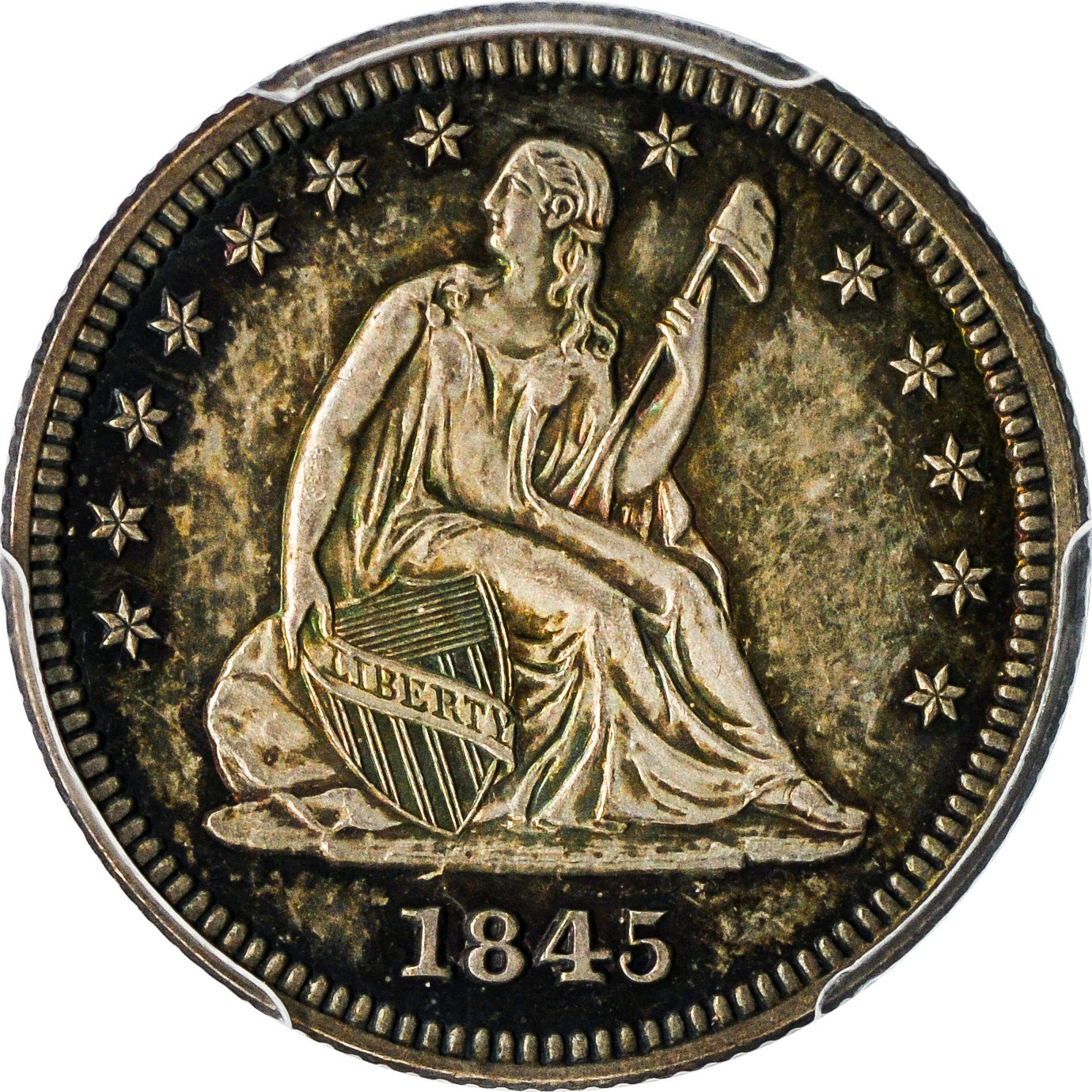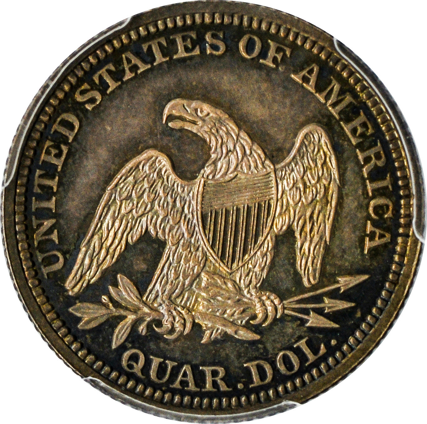 The quarter then current was Christian Gobrecht’s Seated Liberty design as modified by Robert Ball Hughes. It had been in use since 1838, replacing the Capped Bust motif, and was very familiar to the public. The design depicted Liberty seated on a rock, surrounded by thirteen stars and holding the union shield along with a pole topped by a Liberty cap. On the reverse was the inscription UNITED STATES OF AMERICA and the denomination QUAR. DOL., encircling an eagle clutching arrows and branches.