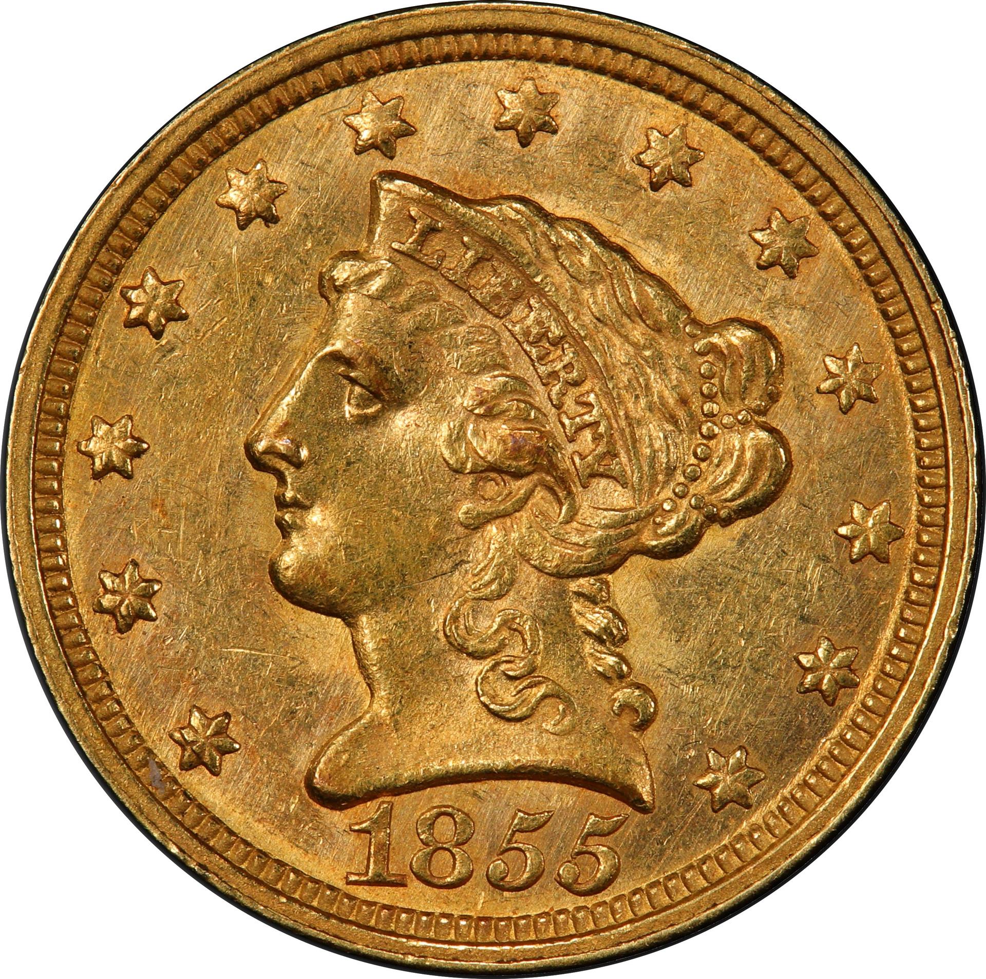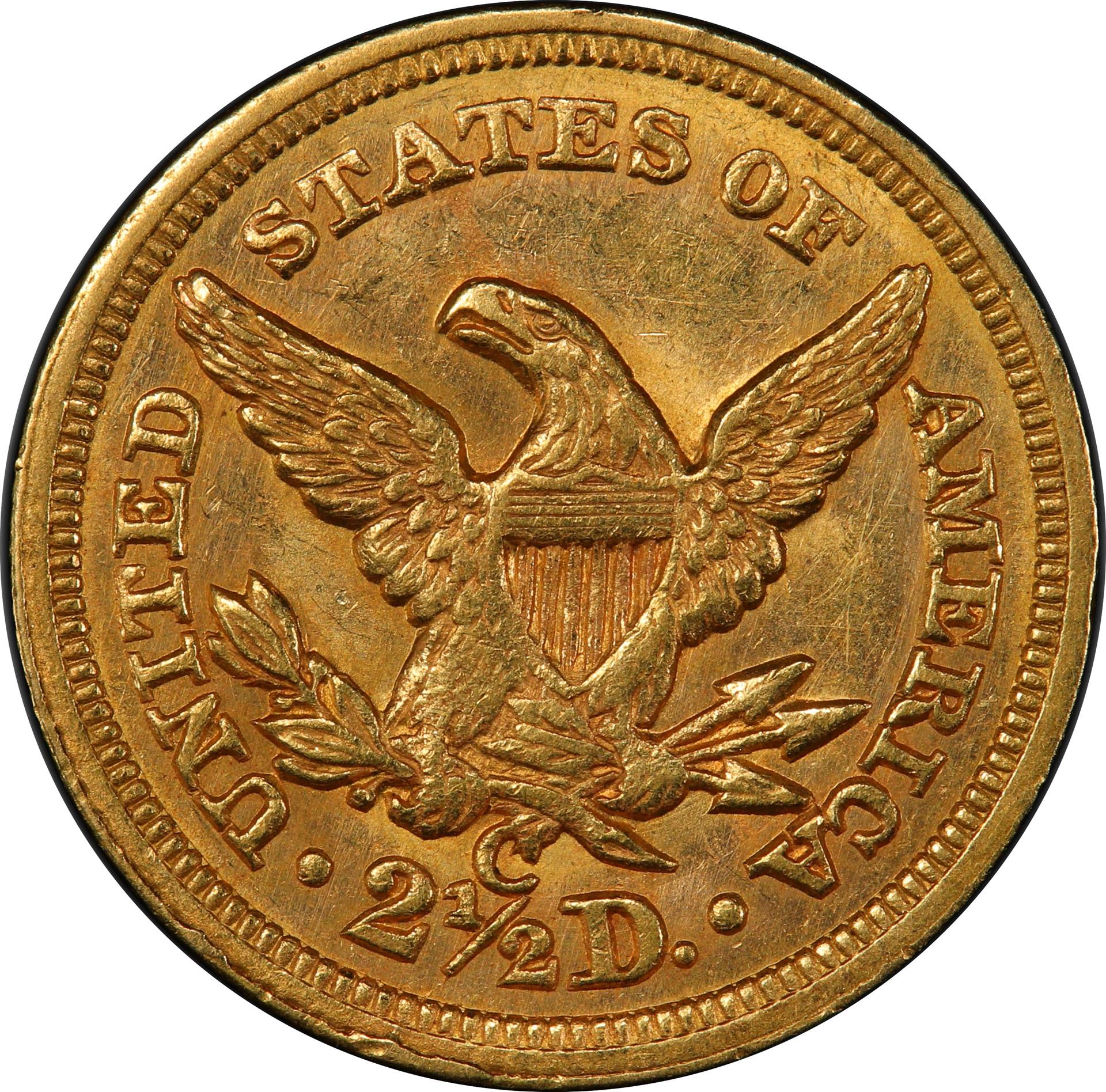 The design as finally adopted featured a large head of Liberty facing left, wearing a wide coronet inscribed with the word LIBERTY. Her hair is pulled back in a bun and held in place by a string of pearls. Thirteen stars are placed around the periphery, representing the original colonies, with the date below. The eagle on the reverse was essentially the same one that had been on quarter eagles since 1808. Originally designed by John Reich, the 1840-1907 version was modified by Gobrecht. The heraldic eagle has its wings spread from rim to rim with the union shield covering its breast. An olive branch representing the country’s peaceful intentions is in the eagle’s right claw, with three arrows emphasizing military preparedness in the left. The legend UNITED STATES OF AMERICA surrounds the eagle, with the denomination 2 1/2 D. beneath the bird.