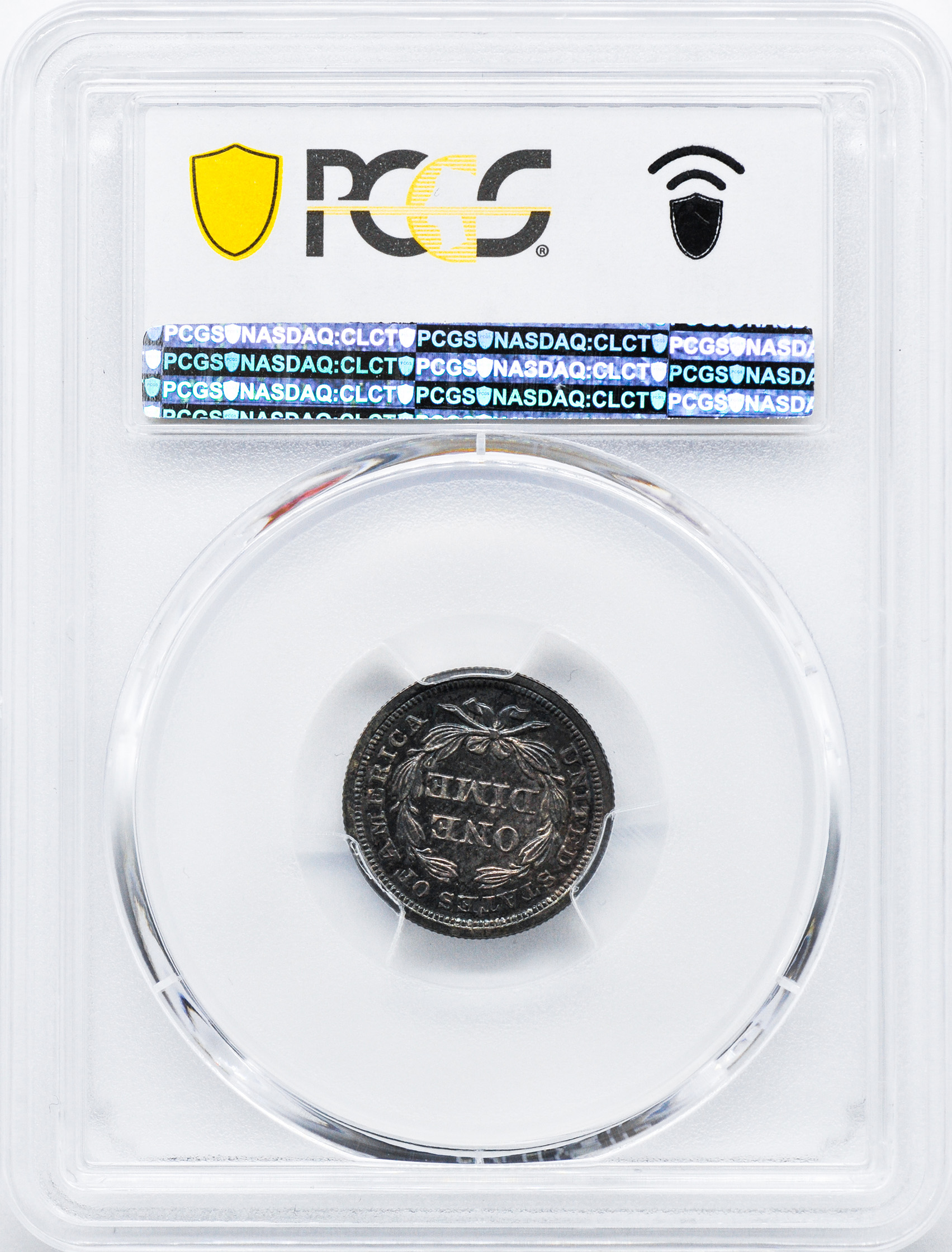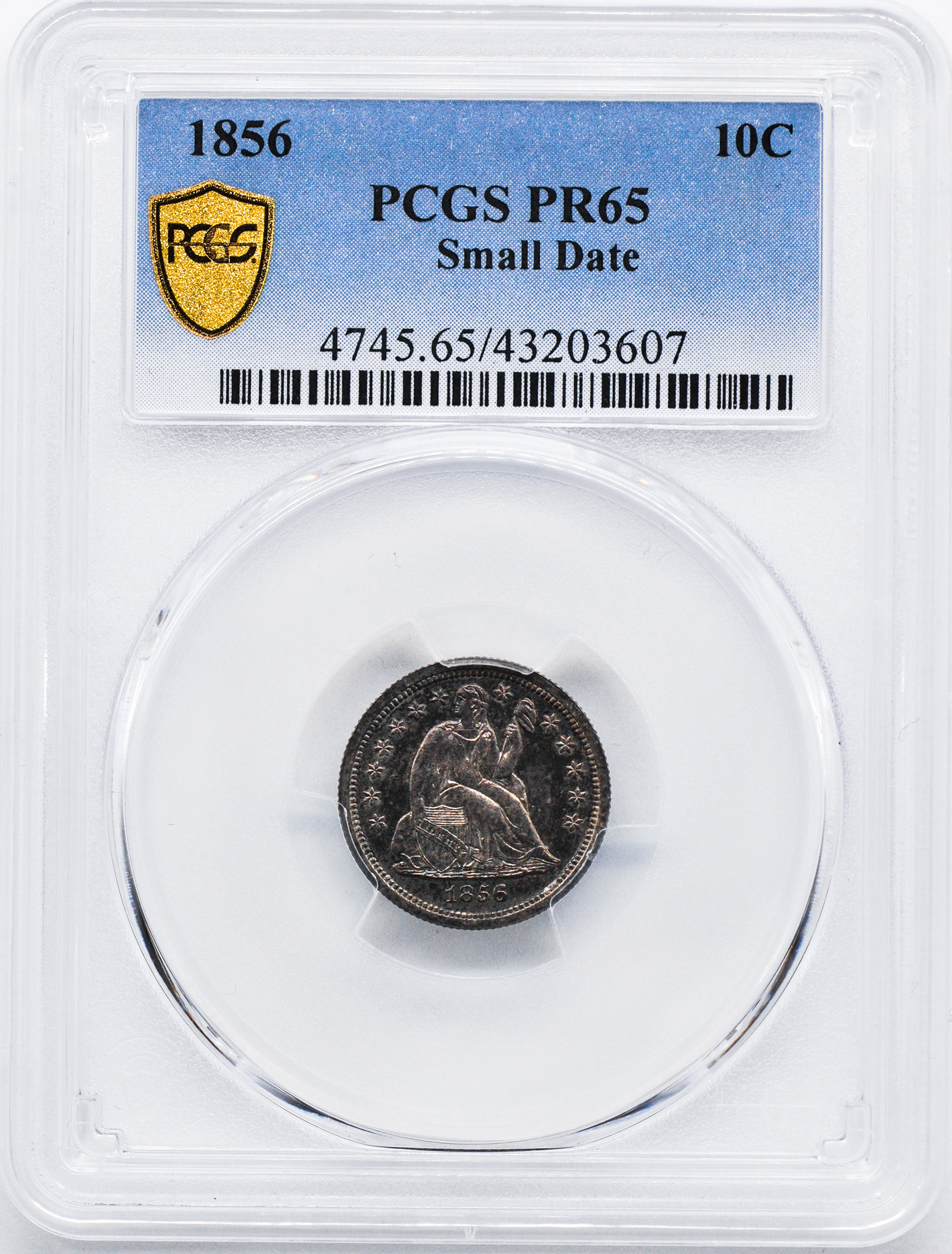 Collectors appreciate this coin for the stunning visual appeal created by the blank fields highlighting the central design, giving the coin a “cameo” appearance. More popularly collected by design type, few collectors try to collect the entire fifty-four year Seated Liberty dime series because of the large number of coins needed and the difficulty in locating and affording the many rare dates and varieties. Type collectors seek the No Stars variety along with the four other major types: 1838-60 With Stars, 1853-55 Arrows, 1860-91 Legend Obverse and 1873-74 Arrows. These five design types are affordable and relatively easy to find in any grade through MS-64.