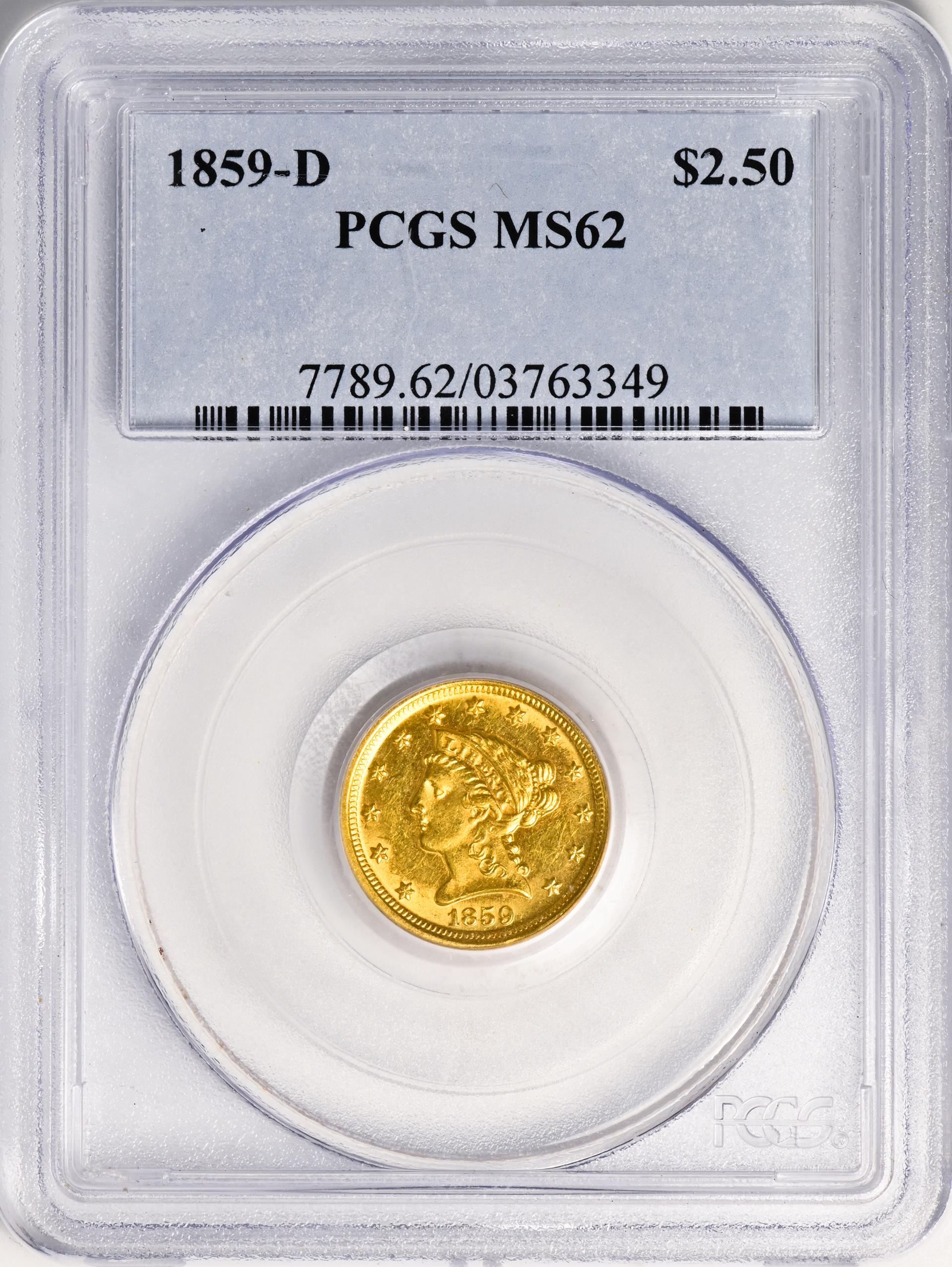 The design as finally adopted featured a large head of Liberty facing left, wearing a wide coronet inscribed with the word LIBERTY. Her hair is pulled back in a bun and held in place by a string of pearls. Thirteen stars are placed around the periphery, representing the original colonies, with the date below. The eagle on the reverse was essentially the same one that had been on quarter eagles since 1808. Originally designed by John Reich, the 1840-1907 version was modified by Gobrecht. The heraldic eagle has its wings spread from rim to rim with the union shield covering its breast. An olive branch representing the country’s peaceful intentions is in the eagle’s right claw, with three arrows emphasizing military preparedness in the left. The legend UNITED STATES OF AMERICA surrounds the eagle, with the denomination 2 1/2 D. beneath the bird.