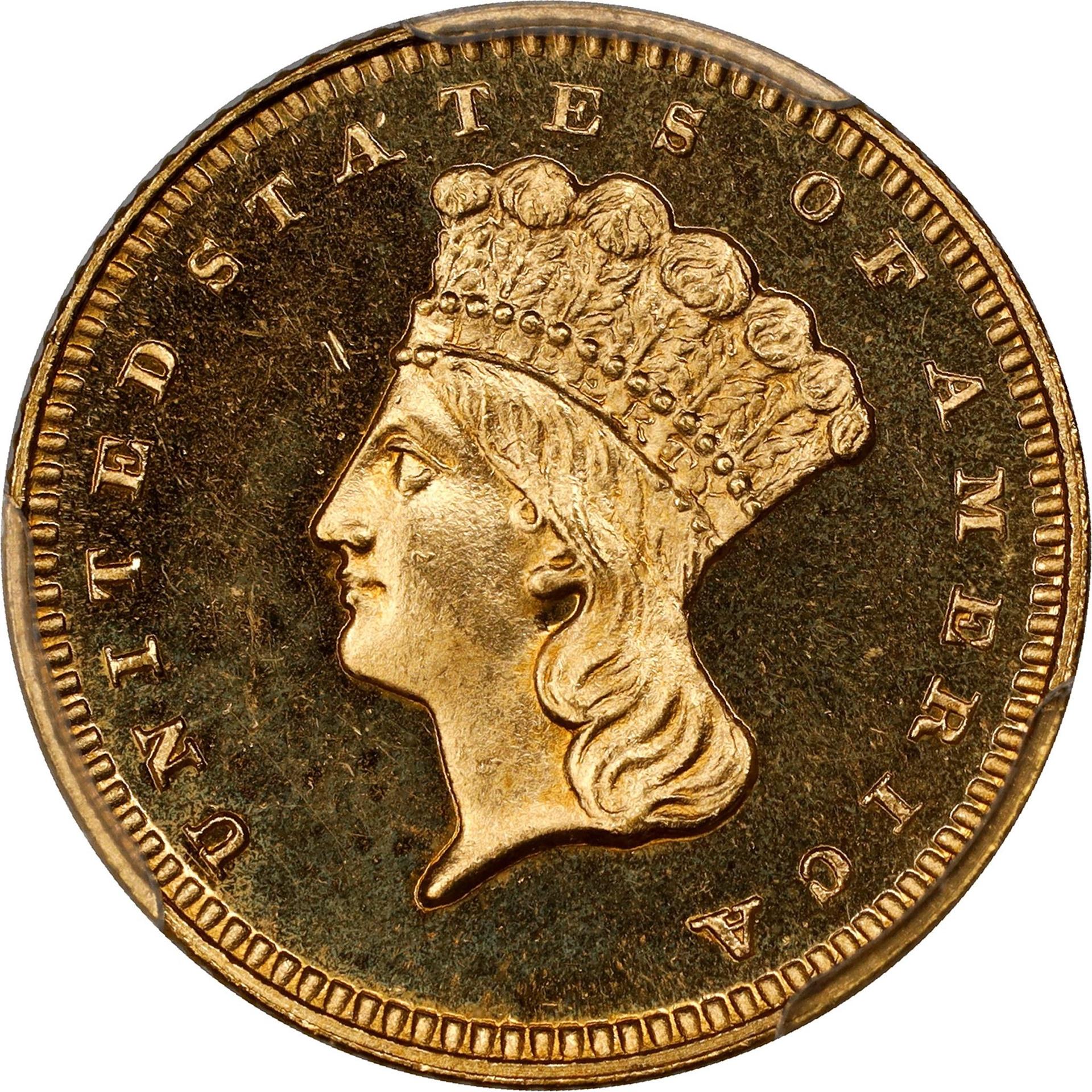 Type 3 gold dollars are far more plentiful in choice mint condition than the two earlier types, and the key points of reference for detecting signs of wear—the cheek and the bow-knot on the wreath—are more likely to be pristine. Gem examples of 1862, 1874 and many dates in the ‘80s are generally available.