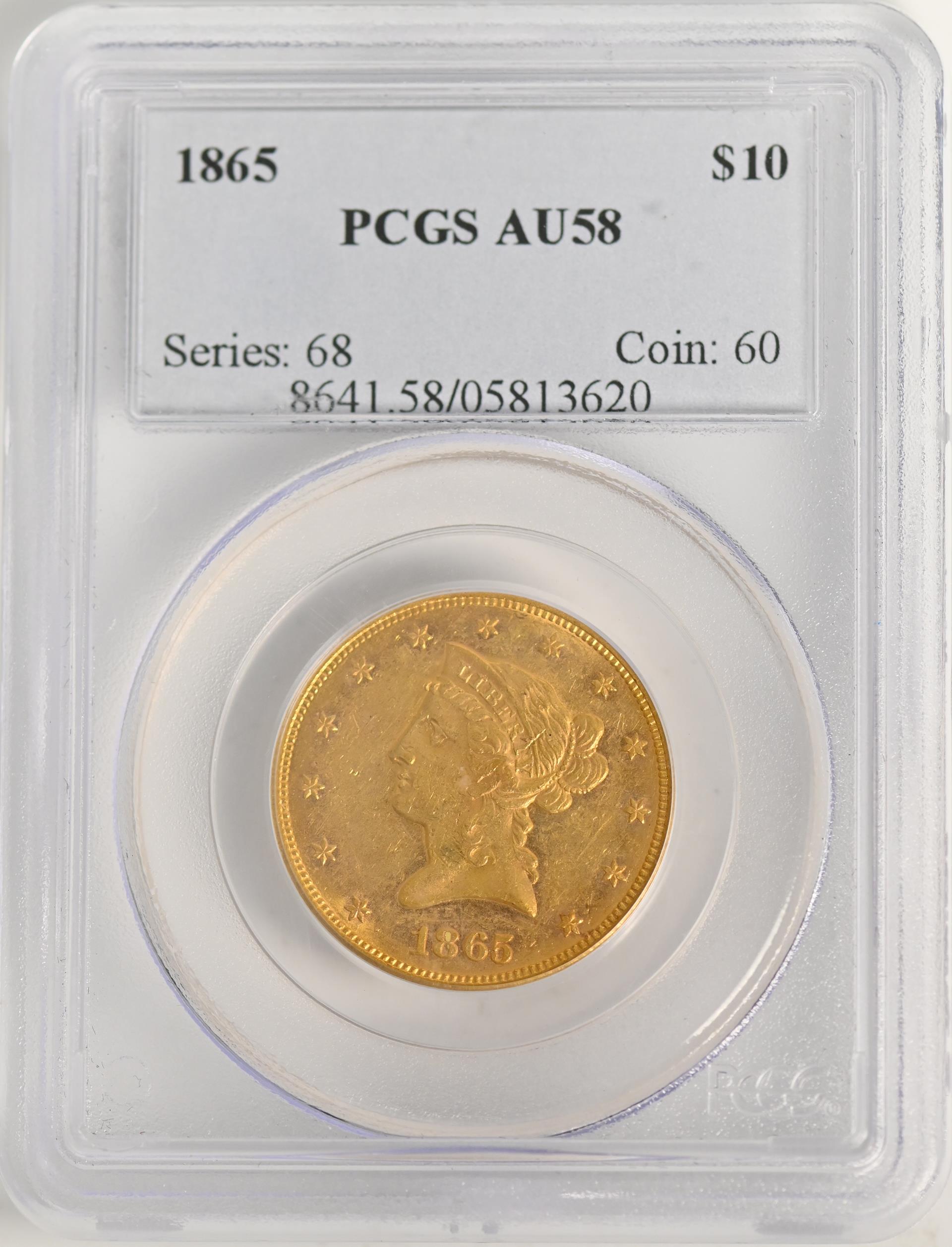 The eagle issued since 1838 was the Christian Gobrecht designed Coronet Head, featuring a neoclassic head of Liberty adorned with a coronet inscribed LIBERTY. 13 stars surround the bust, with the date below. The reverse depicts an eagle holding arrows and an olive branch, encircled by the inscriptions UNITED STATES OF AMERICA and TEN D. Chief Engraver James Barton Longacre placed the new motto on a scroll over the eagle’s head. From 1866 through 1869, only Philadelphia (no mintmark) and the increasingly important San Francisco (S) branch struck this new design. Production began at Carson City, Nevada (CC), in 1870 and continued through 1893. New Orleans (O) coins appeared in 1879, and the new Denver (D) facility began mintage in 1906. Mintmarks are found on the reverse, below the eagle.