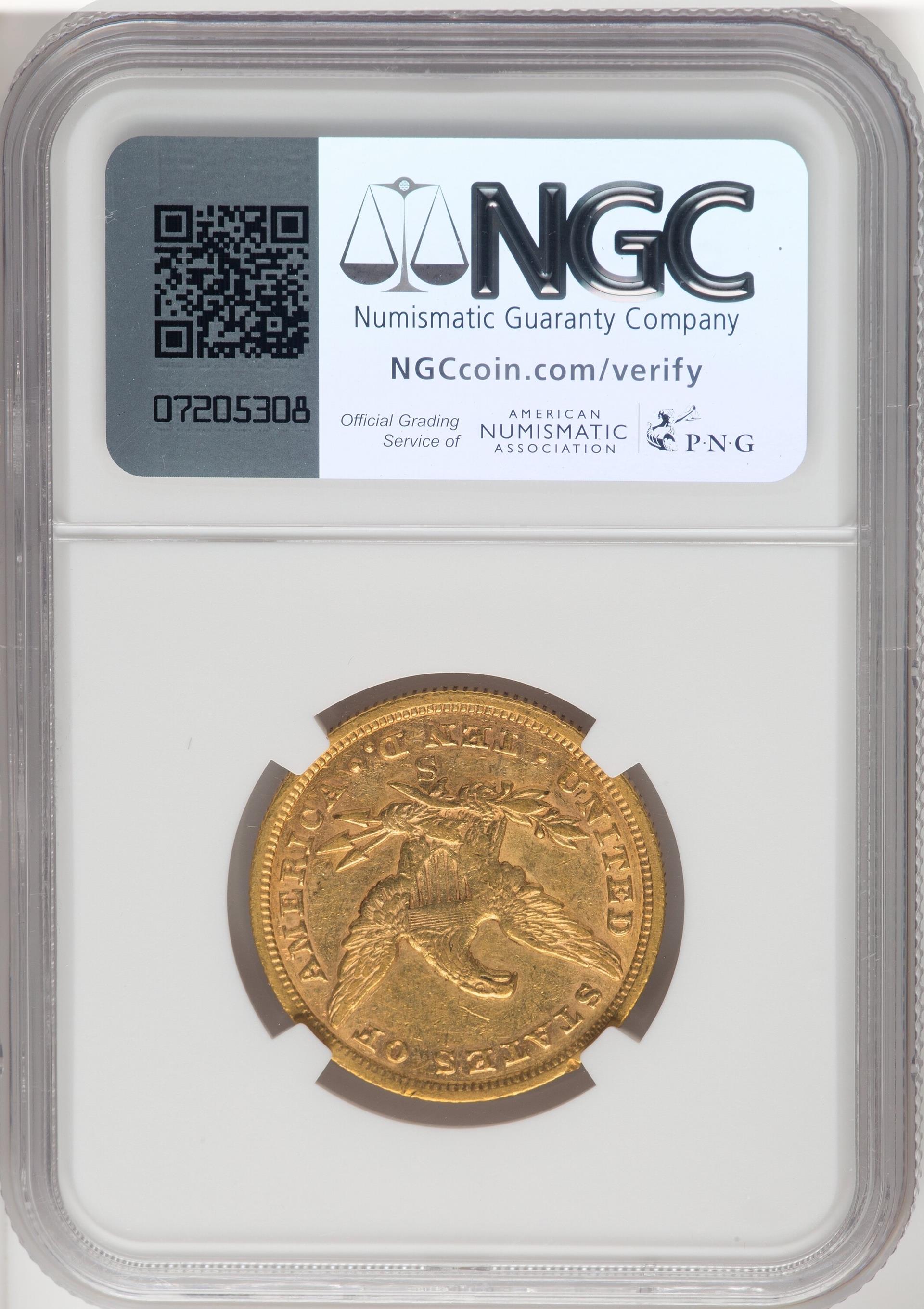 The eagle issued since 1838 was the Christian Gobrecht designed Coronet Head, featuring a neoclassic head of Liberty adorned with a coronet inscribed LIBERTY. 13 stars surround the bust, with the date below. The reverse depicts an eagle holding arrows and an olive branch, encircled by the inscriptions UNITED STATES OF AMERICA and TEN D. Chief Engraver James Barton Longacre placed the new motto on a scroll over the eagle’s head. From 1866 through 1869, only Philadelphia (no mintmark) and the increasingly important San Francisco (S) branch struck this new design. Production began at Carson City, Nevada (CC), in 1870 and continued through 1893. New Orleans (O) coins appeared in 1879, and the new Denver (D) facility began mintage in 1906. Mintmarks are found on the reverse, below the eagle.