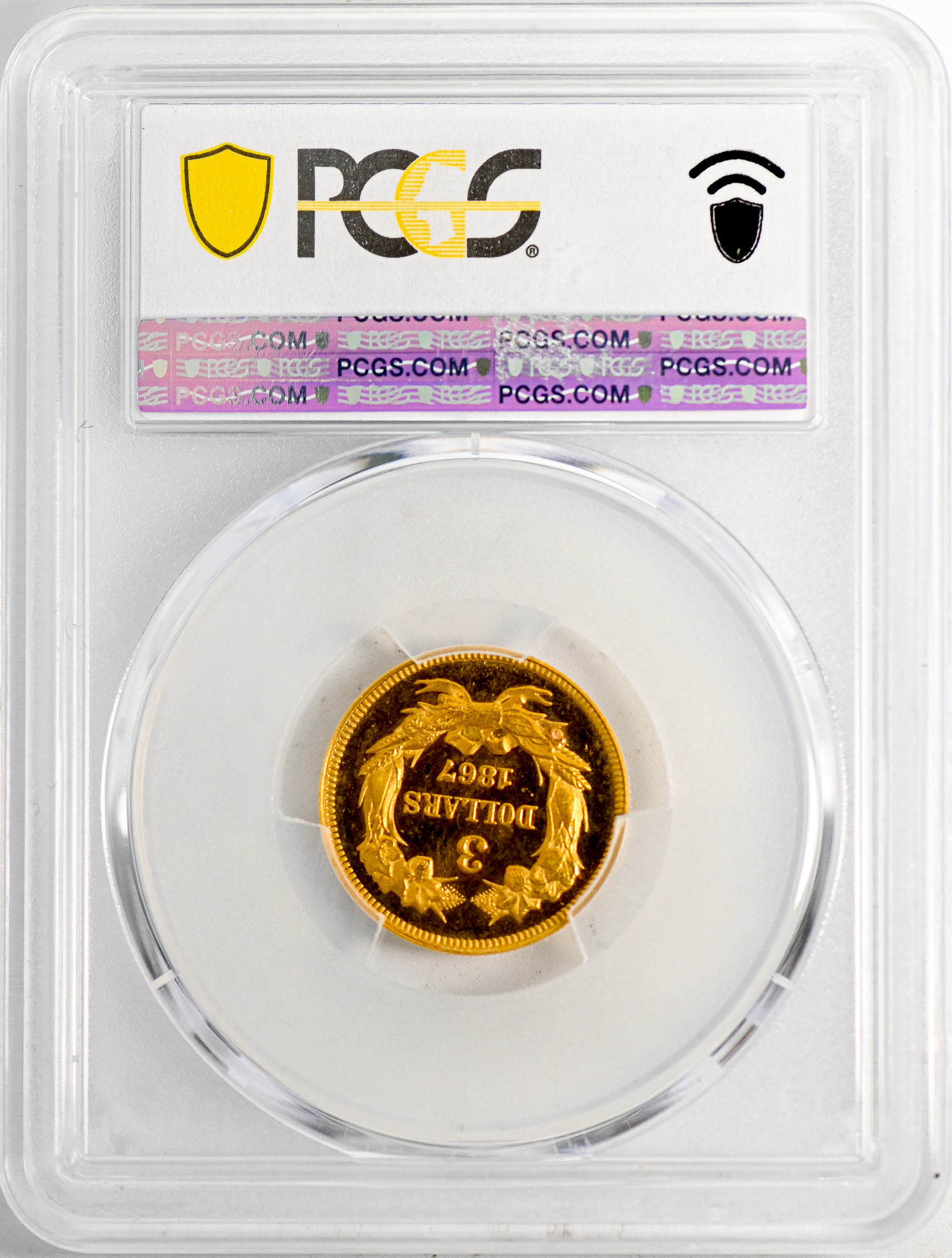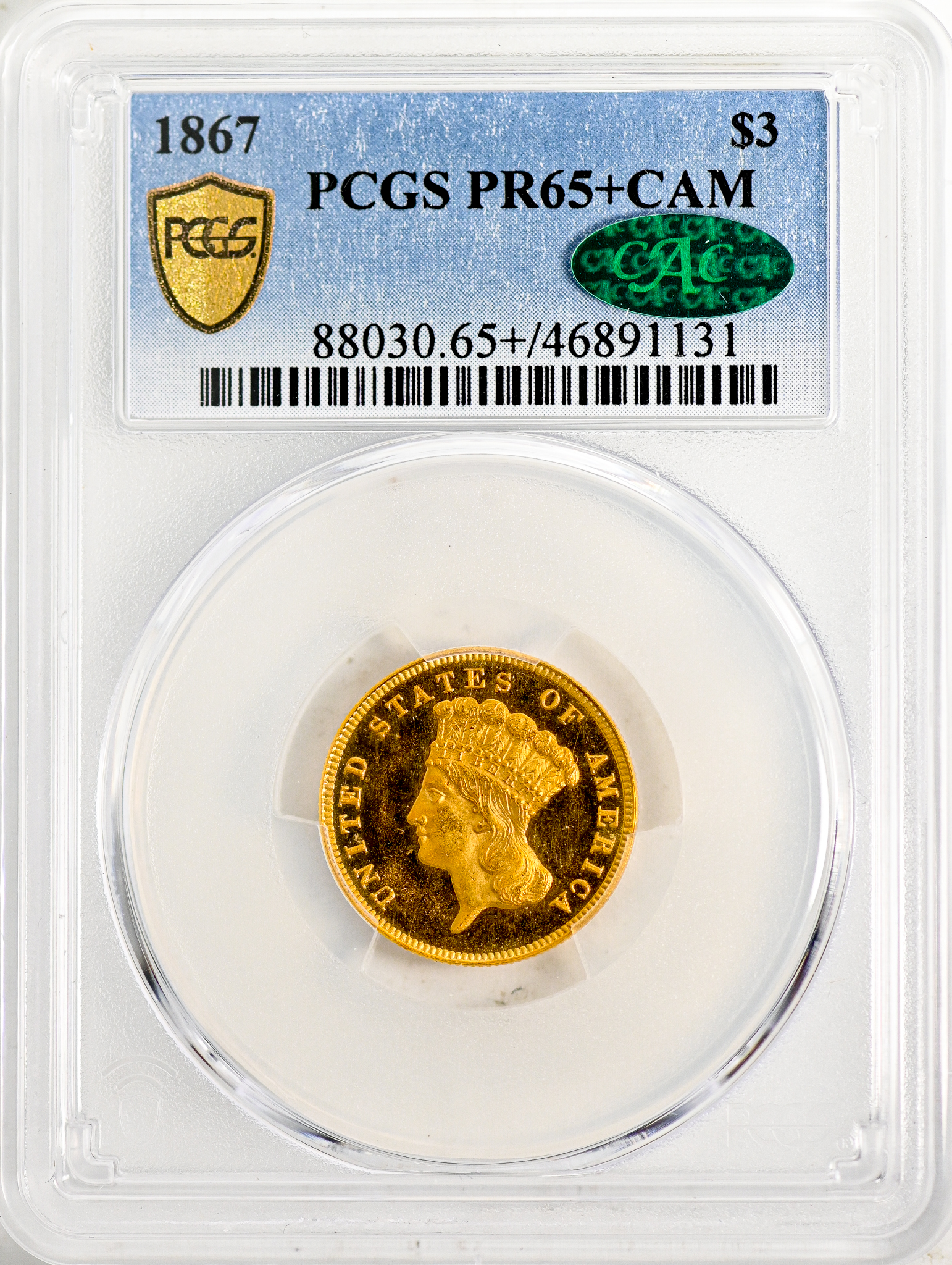 Every U.S. denomination boasts a number of major rarities. The three-dollar gold coinage of 1854-1889 is studded with so many low-mintage dates that the entire series may fairly be called rare. In mint state 1878 is the most common date, followed by the 1879, 1888, 1854, 1889 and 1874 issues. Every other date is very rare in high grade, particularly 1858, 1865, 1873 Closed 3 and all the San Francisco issues. Minuscule mintages were the rule in the later years. Proof coins prior to 1859 are extremely rare and more difficult to find than the proof-only issues of 1873 Open 3, 1875 and 1876, but many dates are even rarer in the higher mint state grades. This is because at least some proofs were saved by well- heeled collectors, while few collectors showed any interest in higher-grade business strikes of gold coins. Counterfeits are known for many dates; any suspicious piece should be authenticated.