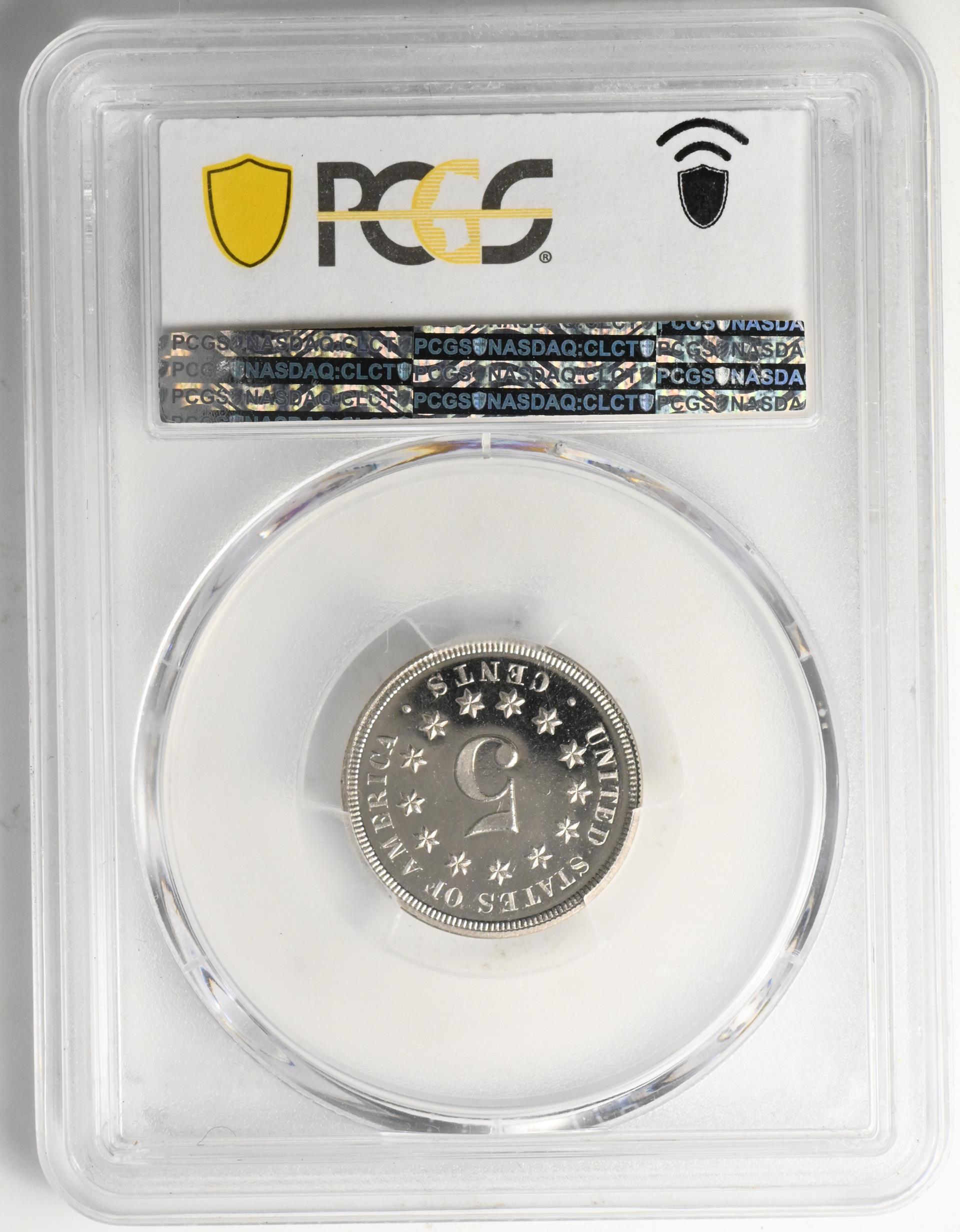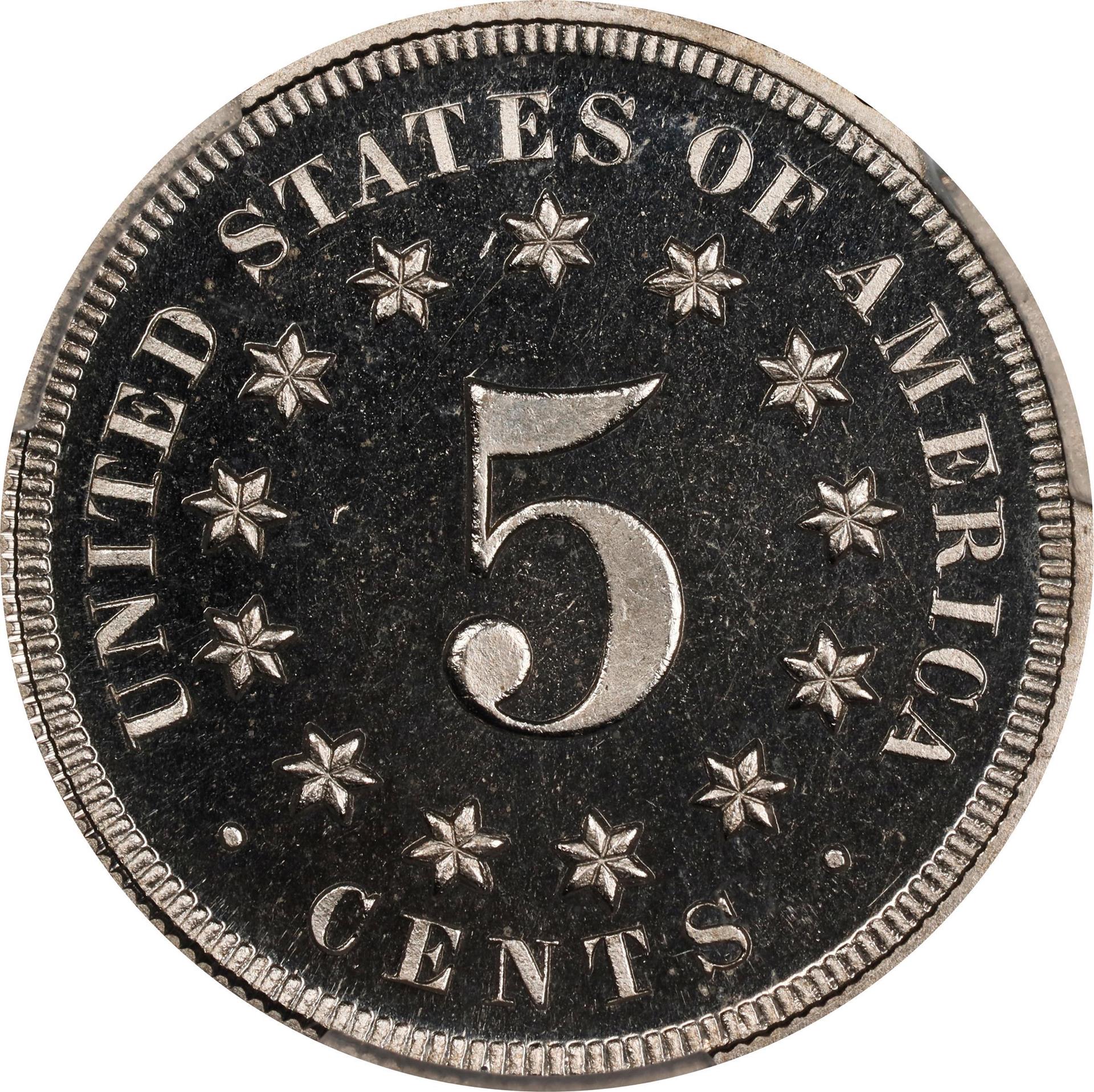 Shield nickels were struck only at the Philadelphia Mint, and more than 126 million were produced from 1866 until the next design change in 1883. For such a short-lived series there are a surprising number of rarities. The two key issues are from 1877 and 1878, when only proofs were struck. Among business strikes, the years 1879-1881 are low mintage dates and worth large premiums in all grades. There are two overdates, the 1879/8—an overdated proof—and the 1883/2.