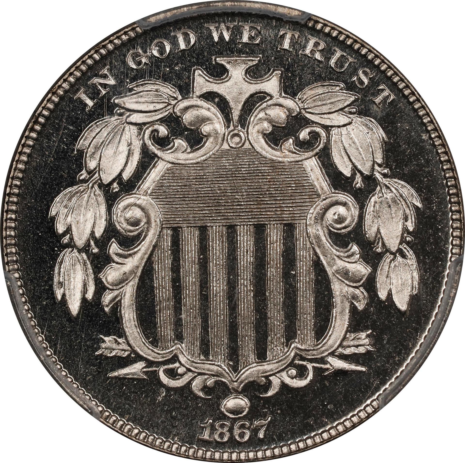 The new coins seldom struck up well, and more dies were broken striking Shield nickels than all other denominations added together. During the first two years of issue the rays were retained on the reverse, but early in 1867 they were eliminated as Mint officials believed this design element prevented the coins from striking up completely.