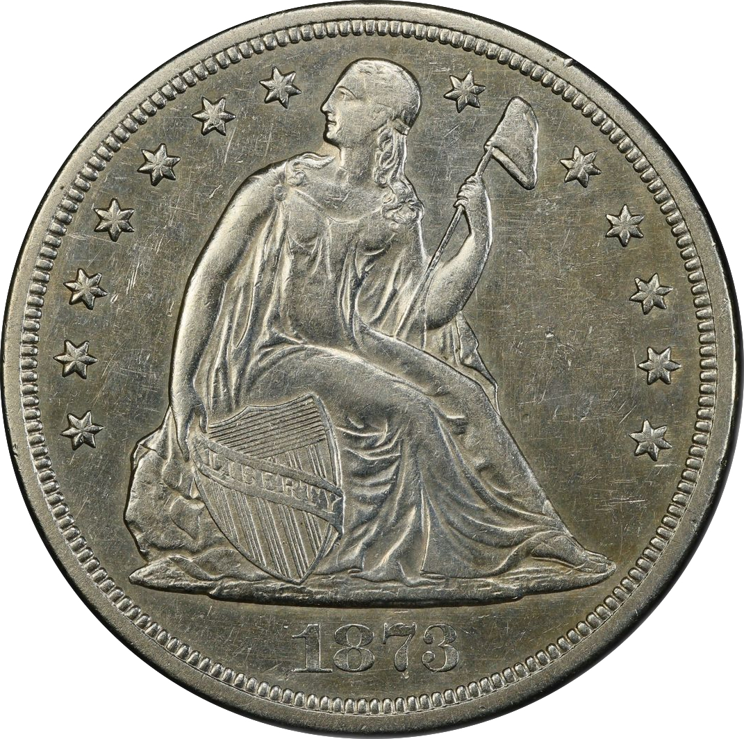The Seated Liberty series continued from 1866 to 1873 with the reverse motto IN GOD WE TRUST. The coinage act of Feb. 12, 1873 discontinued the silver dollar and abolished the legal tender status of all silver dollars struck from 1794 to 1873. This is the law later savagely denounced by the vocal partisans of free and unlimited coinage of silver as the “Crime of ‘73.” Legal tender status was restored to the standard silver dollar under the Bland-Allison Act of 1878, which prompted the coining of millions of Morgan Dollars.