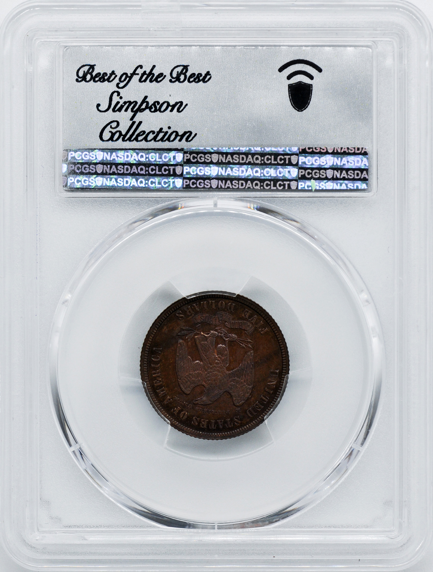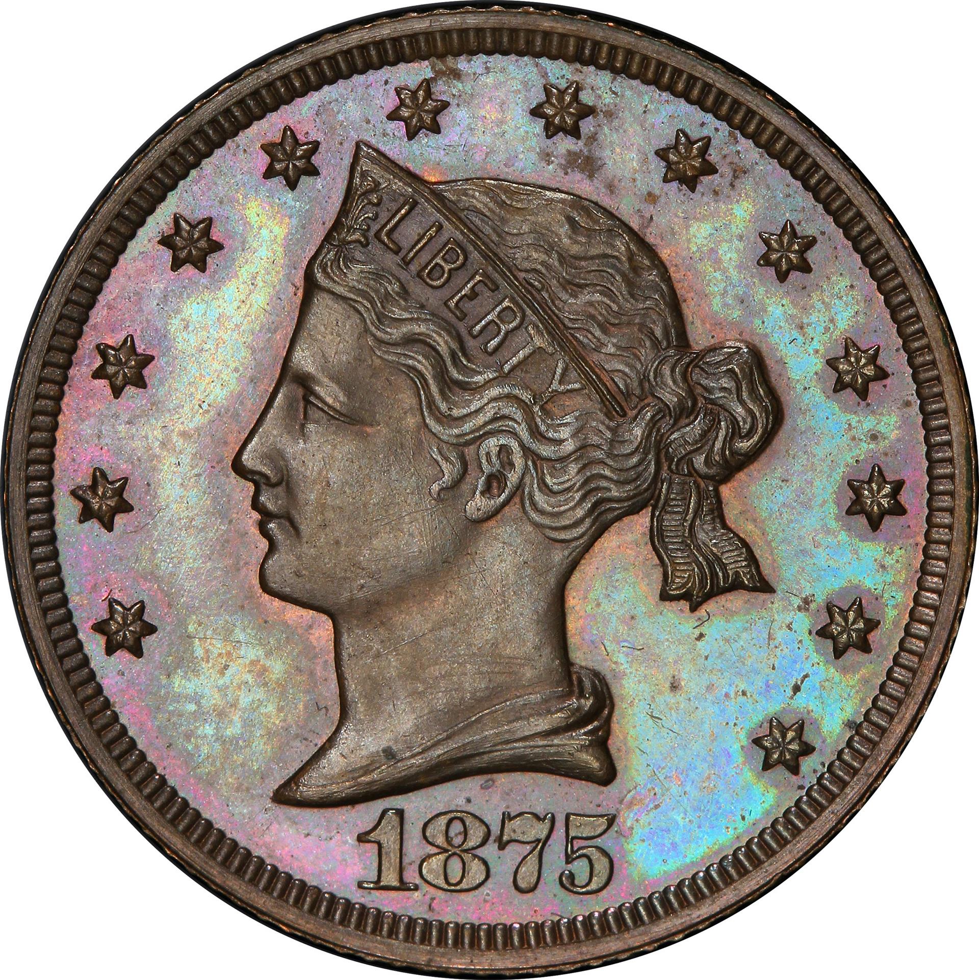 By 1861, as the dark cloud of the Civil War descended upon the nation, experiments with religious mottos accounted for many new proposals. After the motto IN GOD WE TRUST was adopted in 1864-66, designs for a new nickel five-cent piece took center stage. It was around this time that aluminum was first used in the Mint, and complete sets of the regular issues in that metal were made, reportedly for Mint Director Henry R. Linderman. It was on Linderman’s watch that restrikes of both regular issues and patterns really came into full swing. Unlike his predecessors, who sought only to embellish the Mint’s own collection, Linderman was not at all reluctant to have coins struck on his own behalf. One conduit through which these pieces left the Mint was Philadelphia pharmacist and numismatic “insider” R. Coulton Davis (1813-1888). Davis published the first catalog of U.S. pattern coins as a series in the American Journal of Numismatics, 1885-87. The late Walter Breen attributed Davis’ favored status to his willingness to supply key personnel with opium-based patent medicines then in widespread use.