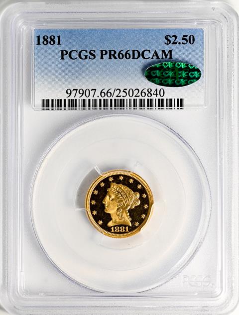 The design as finally adopted featured a large head of Liberty facing left, wearing a wide coronet inscribed with the word LIBERTY. Her hair is pulled back in a bun and held in place by a string of pearls. Thirteen stars are placed around the periphery, representing the original colonies, with the date below. The eagle on the reverse was essentially the same one that had been on quarter eagles since 1808. Originally designed by John Reich, the 1840-1907 version was modified by Gobrecht. The heraldic eagle has its wings spread from rim to rim with the union shield covering its breast. An olive branch representing the country’s peaceful intentions is in the eagle’s right claw, with three arrows emphasizing military preparedness in the left. The legend UNITED STATES OF AMERICA surrounds the eagle, with the denomination 2 1/2 D. beneath the bird.