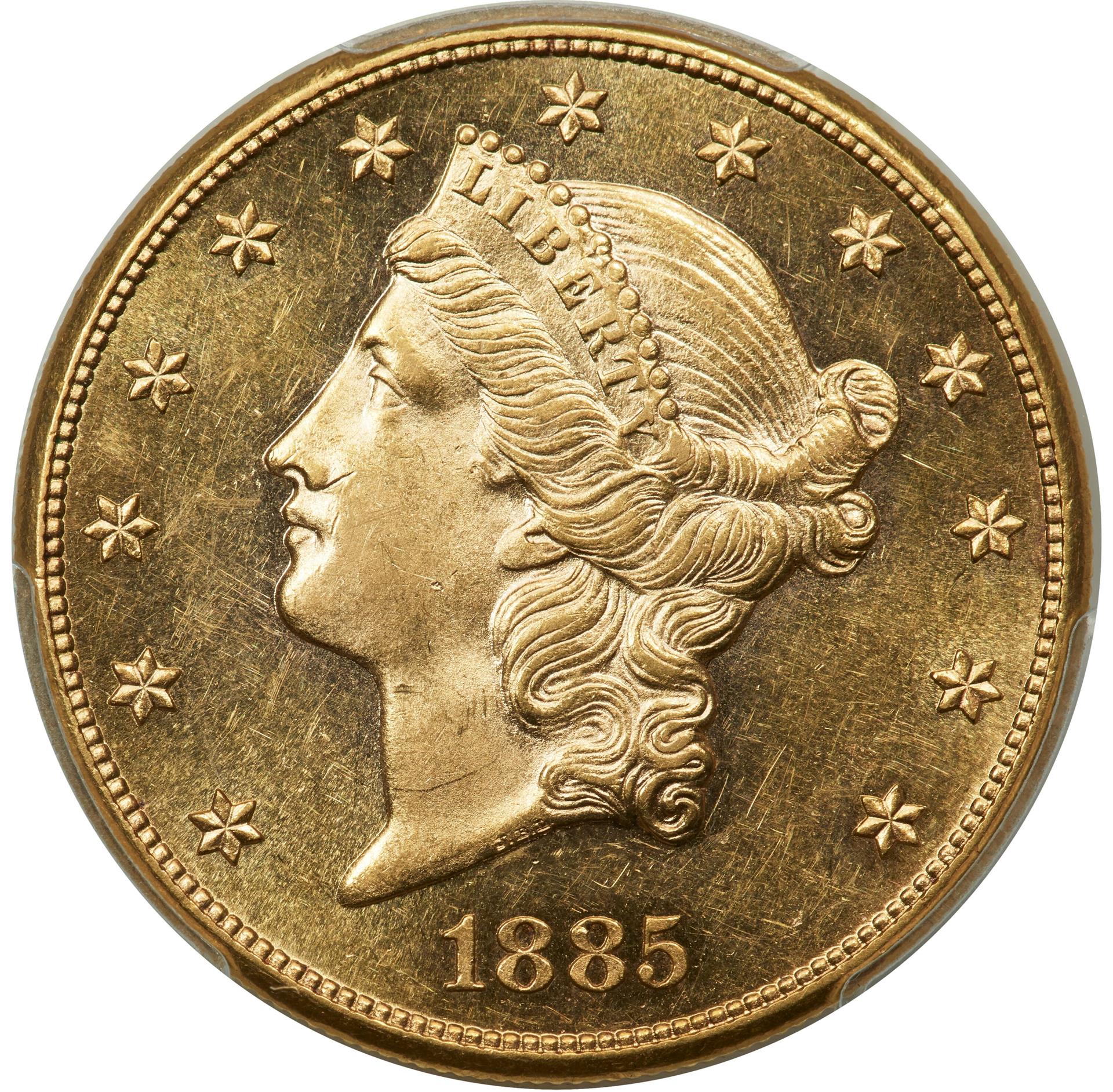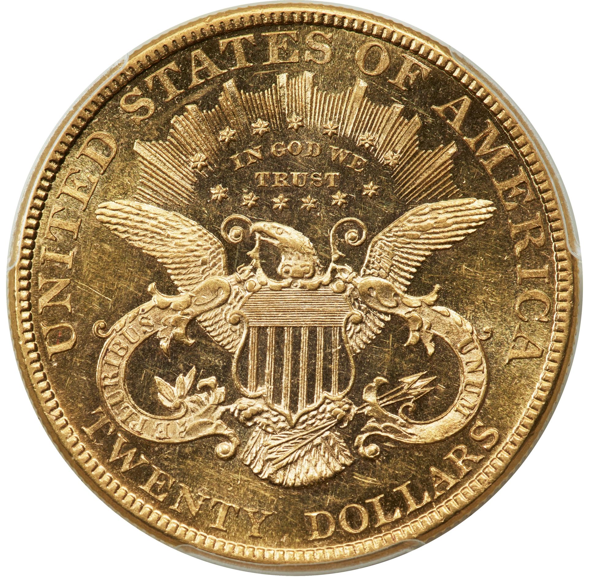 The Liberty double eagle design is credited to James B. Longacre but has its roots in Christian Gobrecht’s $10 Eagle of 1839. The obverse features a Greco-Roman head of Liberty facing left, with hair tied in a bun and curls flowing down to the base of the bust. She is wearing a coronet inscribed with LIBERTY. Thirteen stars surround the bust with the date positioned below. The reverse depicts an eagle with outstretched wings holding an olive branch and arrows. A shield with straight sides (Type 1) gave way to a rounded ornate shield in 1866 when the motto IN GOD WE TRUST was added to the oval of stars above the eagle (Type 2). There is a pattern of rays in a semicircle touching each wing. In 1877, Chief Engraver William Barber tilted Liberty's head forward and replaced the denomination TWENTY D. with TWENTY DOLLARS (Type 3).