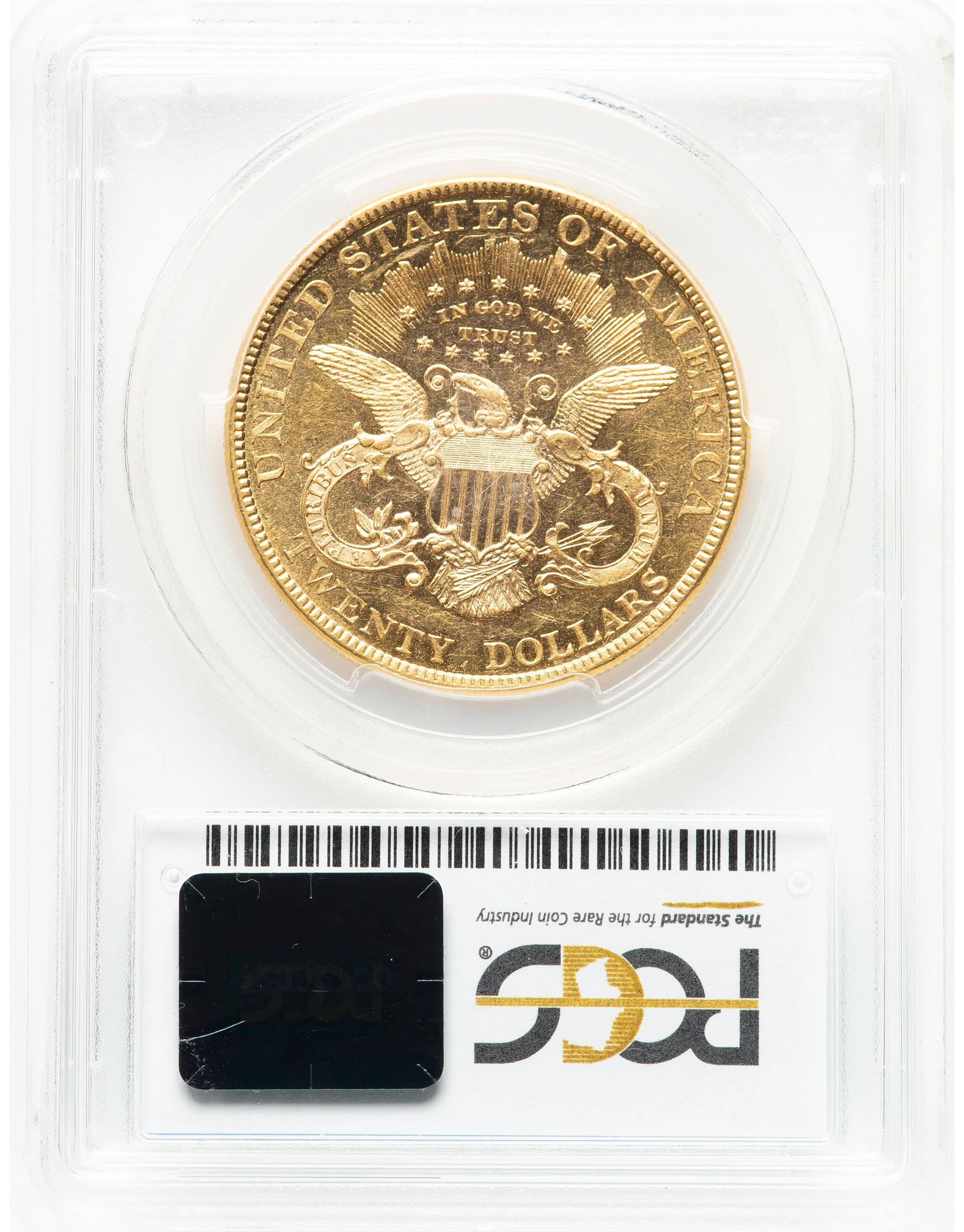 A similar situation exists for mint state early $20’s. Only bankers ever saw this coin in any quantity from 1857 to 1865. Very few uncirculated coins were saved, and most existing today came from the famed Baltimore Hoard of over 3,600 U.S. gold coins found by two young boys in an empty cellar in May of 1934. All of the coins were dated between 1834 and 1856. The hoard included 317 Double Eagles—92 dated 1850 and one 1856-O.