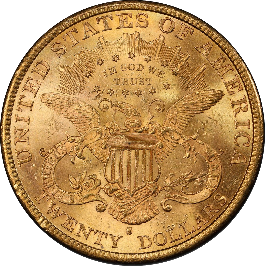 The Type 1 (or No Motto) double eagles were struck at the Philadelphia Mint every year from 1850 through 1865, at New Orleans from 1850 through 1861, and at San Francisco from 1854 through 1866. The O or S mintmark is found below the eagle’s tail. Average mintages were several hundred thousand, but ranged up to just under three million for the 1861 issue. The San Francisco coins of 1866 were the last of the design, and were also issued as part of the Type 2 series, with the new motto IN GOD WE TRUST.