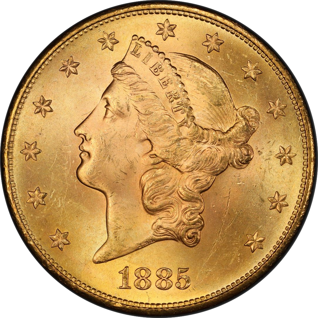 The Liberty double eagle design is credited to James B. Longacre but has its roots in Christian Gobrecht’s $10 Eagle of 1839. The obverse features a Greco-Roman head of Liberty facing left, with hair tied in a bun and curls flowing down to the base of the bust. She is wearing a coronet inscribed with LIBERTY. Thirteen stars surround the bust with the date positioned below. The reverse depicts an eagle with outstretched wings holding an olive branch and arrows. A shield with straight sides (Type 1) gave way to a rounded ornate shield in 1866 when the motto IN GOD WE TRUST was added to the oval of stars above the eagle (Type 2). There is a pattern of rays in a semicircle touching each wing. In 1877, Chief Engraver William Barber tilted Liberty's head forward and replaced the denomination TWENTY D. with TWENTY DOLLARS (Type 3).