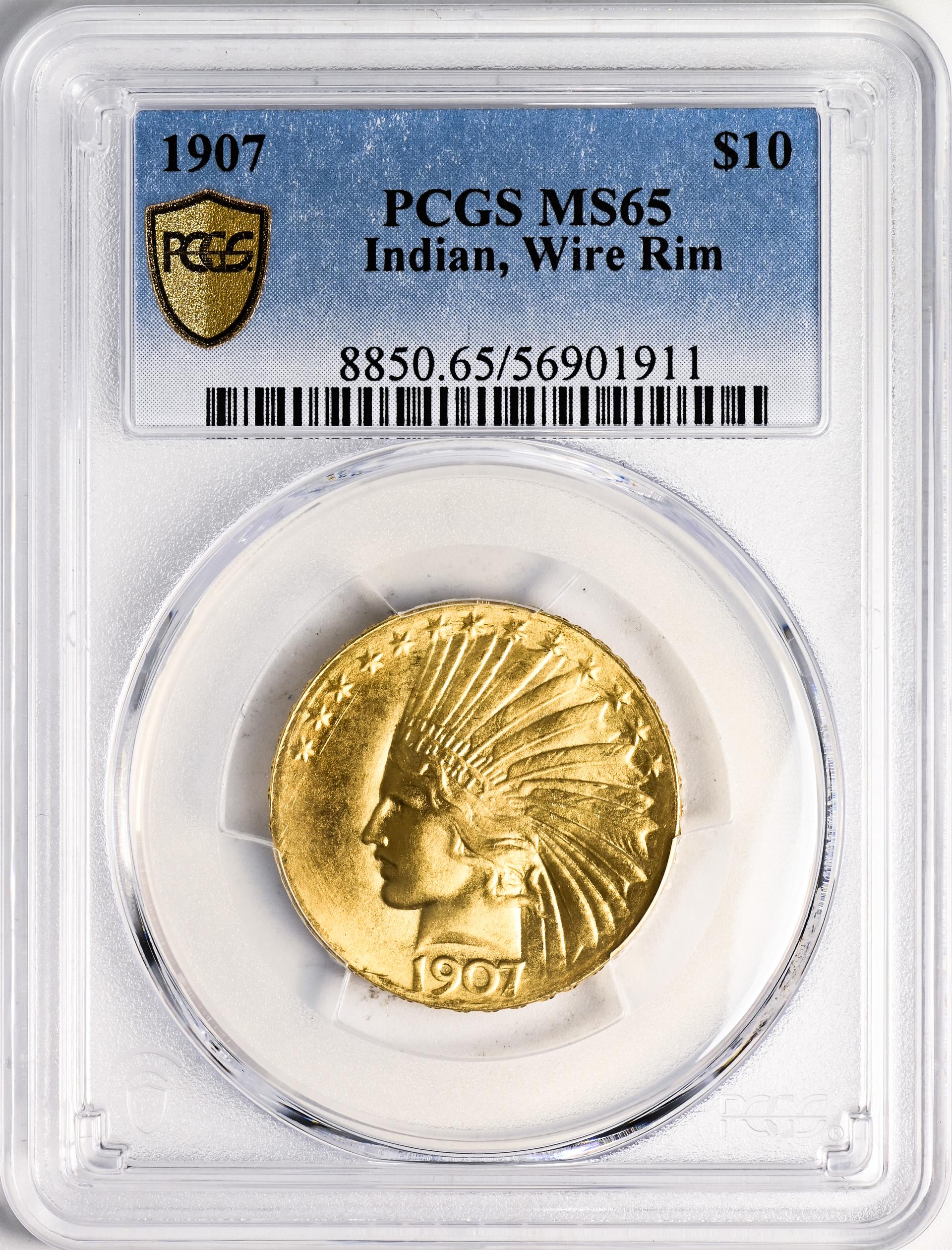 Lower relief than that demanded for Saint-Gaudens’ controversial high relief double eagle made it possible to begin minting the new $10 coins in 1907. First to be struck were the “Wire Edge” pieces, without the raised rim traditionally on U.S. coins. Five hundred were made, with 46 raised stars on their edges—symbolizing the 46 states—along with one plain-edge satin proof. These all bore triangular “periods” in legend and motto. The wire edge proved impractical, however, since the coins would not stack. Next, 31,550 pieces were struck retaining the triangular periods, but both sides were protected by a “Rolled Edge”—the sharply raised rims ordinarily used. Unfortunately, this change resulted in unsatisfactory striking quality. Rather than release these coins to possible public criticism, officials decided to melt all but 42 pieces. Ironically, this coin was intended for circulation, and although never officially released, it is considered a business strike—not a pattern.